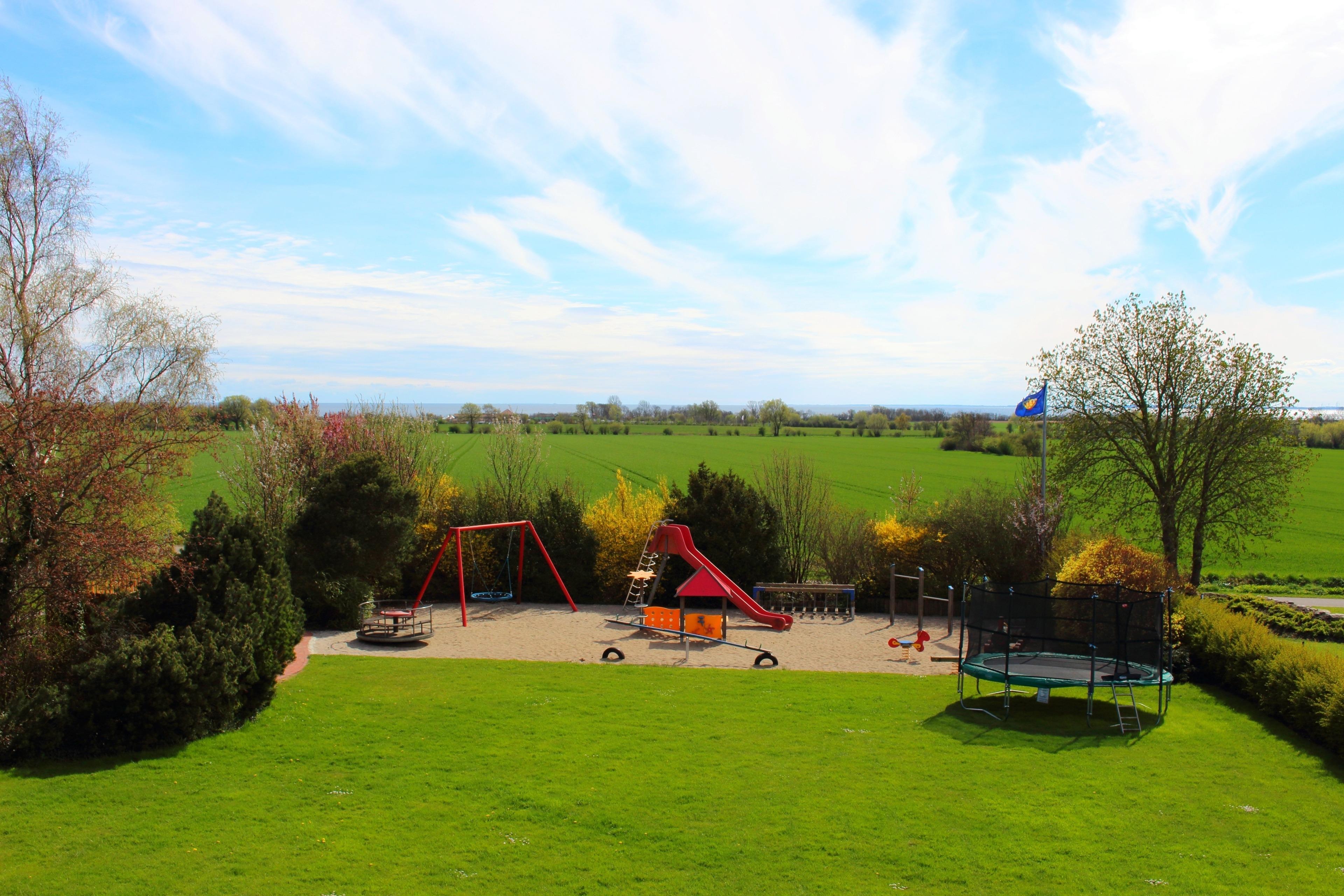 Viel Freiraum zum Spielen ist auf der Wiese am Haus mit dem großzügig angelegten Spielplatz.