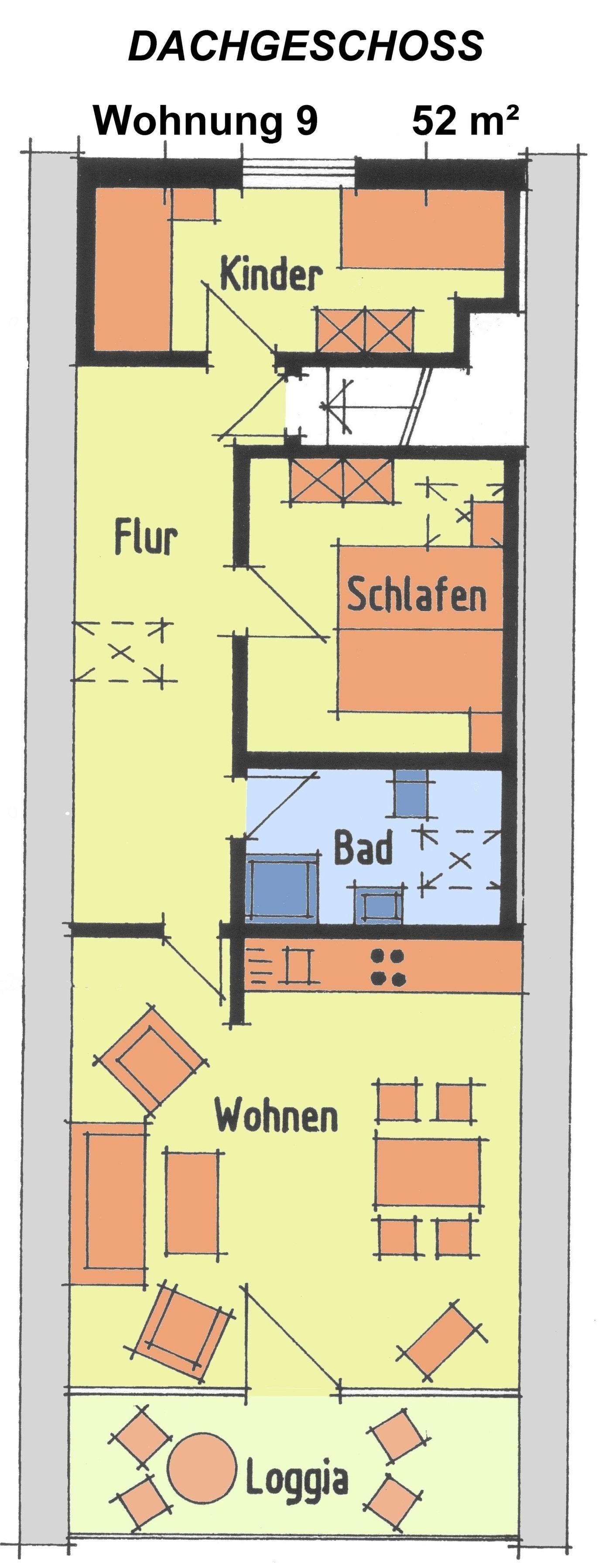 Die Ferienwohnung Nr. 9 (kein Meerblick) besteht aus Wohnraum mit Küchenzeile, zwei separaten Schlafzimmern, Dusche/WC und Loggia-Balkon. Der Internetzugang in der Ferienwohnung (W-Lan) ist kostenlos verfügbar.