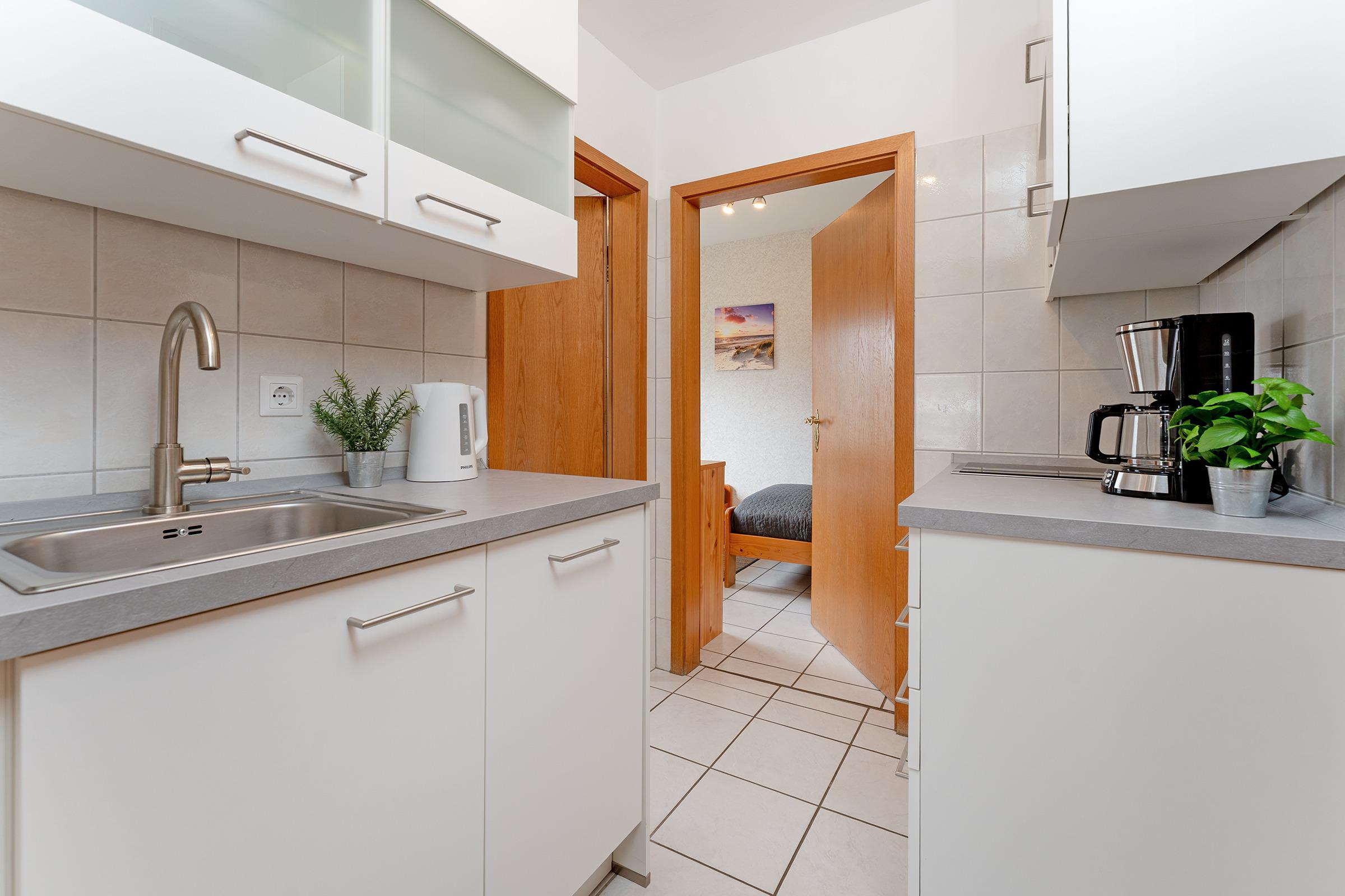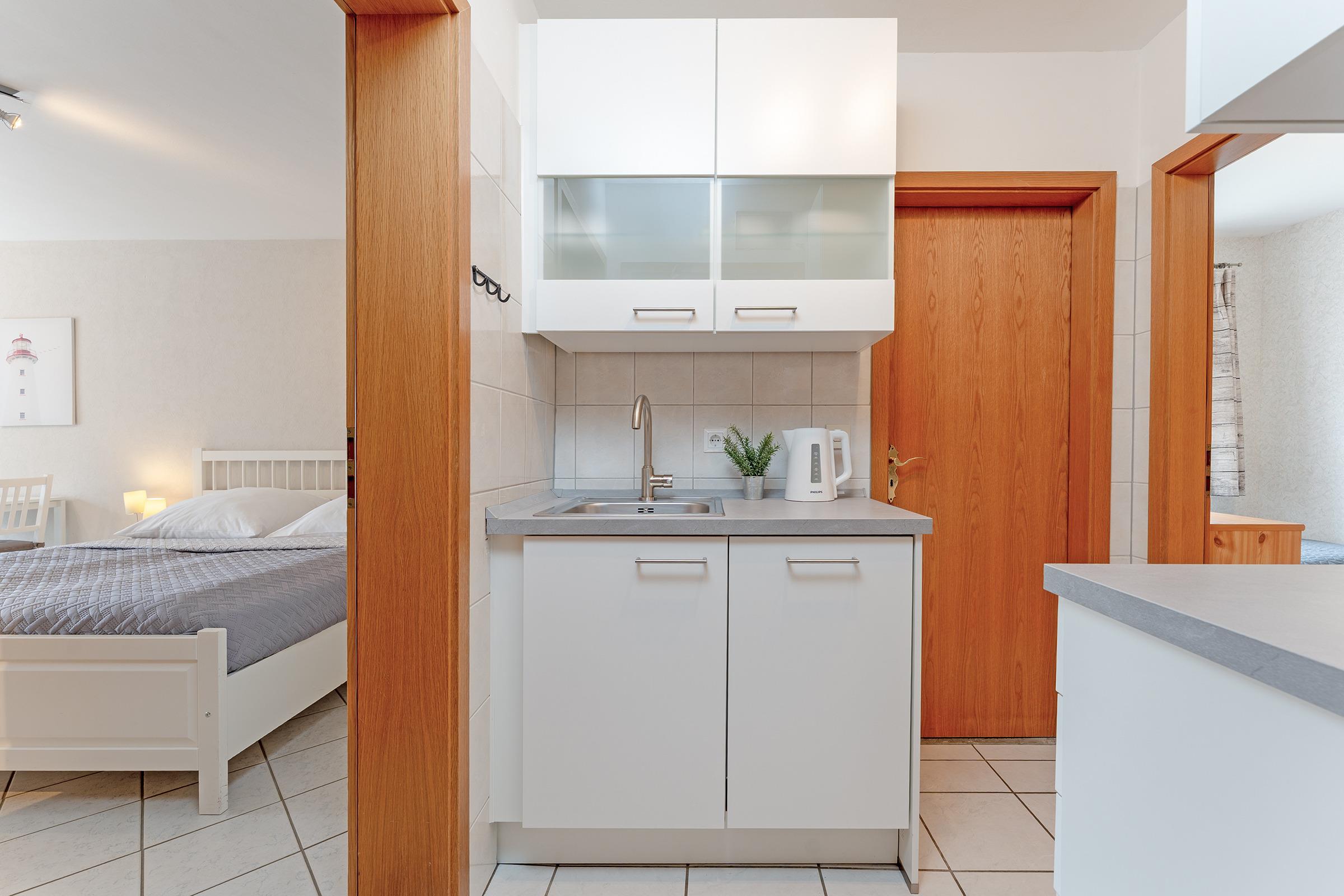 Passend zum Namen Möwe präsentiert sich die Wohnung mit frischen weißen und blauen Farbelementen. Der kombinierte Wohn- und Schlafraum mit gemütlicher Sitzecke und Doppelbett (2x 80x200 cm) lädt zum Verweilen ein. Daneben gibt es ein weiteres Schlafzimmer mit zwei 2 Einzelbetten (je 90x190 cm). Die kleine Pantry-Küche macht Sie flexibel. Das Duschbad ist funktional ausgestattet und hat ein Fenster.