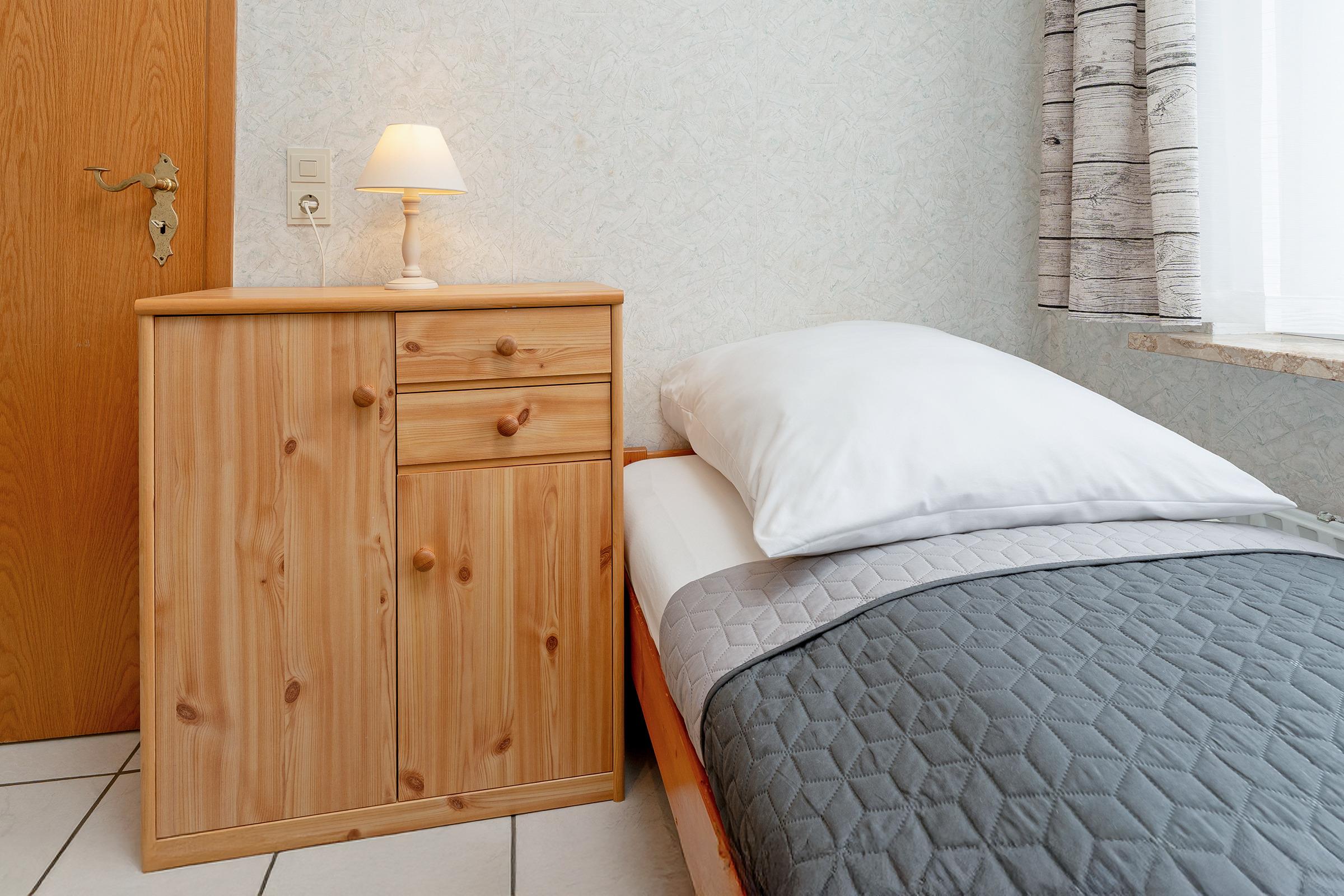 Schlafzimmer: 2 Einzelbetten (je 90x190 cm), Verdunkelung: Gardinen, kein Platz für ein Babybett vorhanden