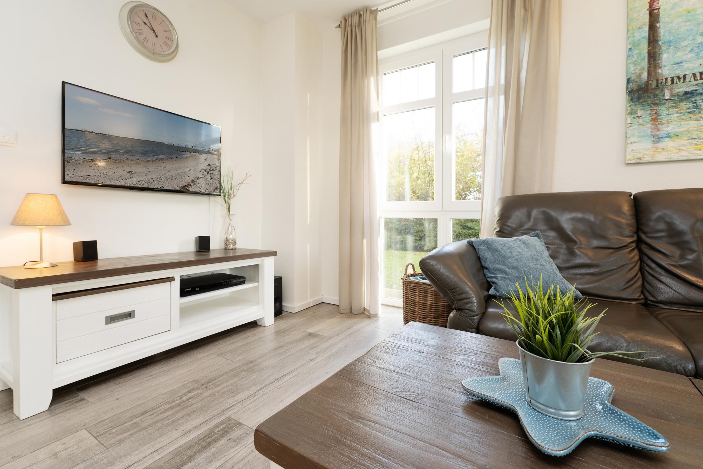 Die Ferienwohnung An der Waterkant besticht durch ihre zentrale Lage und bietet beste Voraussetzungen für einen entspannten Urlaub für die ganze Familie. Vom großen Wohn-Essbereich mit modernen Landhausmöbeln gelangen Sie auf die großzügige Südterrasse mit gemütlicher Sitzecke und angrenzender Rasenfläche. Gleichzeitig lädt die gemütliche Sitzecke mit Ledersofa, Relax-Sessel und Flachbildfernseher zum Entspannen ein. Die gut ausgestattete Wohnküche mit Geschirrspüler, Herd, Backofen, Mikrowelle, Kühlschrank, Kaffeemaschine etc. wird durch den großen Esstisch, der Platz zum Essen und spielen bietet, abgerundet. In den beiden Schlafzimmern findet jeder seinen Rückzugsort. Das größere Schlafzimmer ist mit einem bequemen Boxspringbett (180x200 cm) und Flachbildfernseher ausgestattet. Das zweite Schlafzimmer verfügt über ein großes Doppelbett. Beide Räume bieten durch geräumige Kleiderschränke ausreichend Stauraum für Ihr Gepäck. Das Bad mit ebenerdiger Dusche lässt die Wohnung zu einer kleinen Wohlfühloase werden. Tipp: In wenigen Fahrrad-Minuten erreichen Sie von hier aus den Südstrand, den Hafen und die Burger Innenstadt.