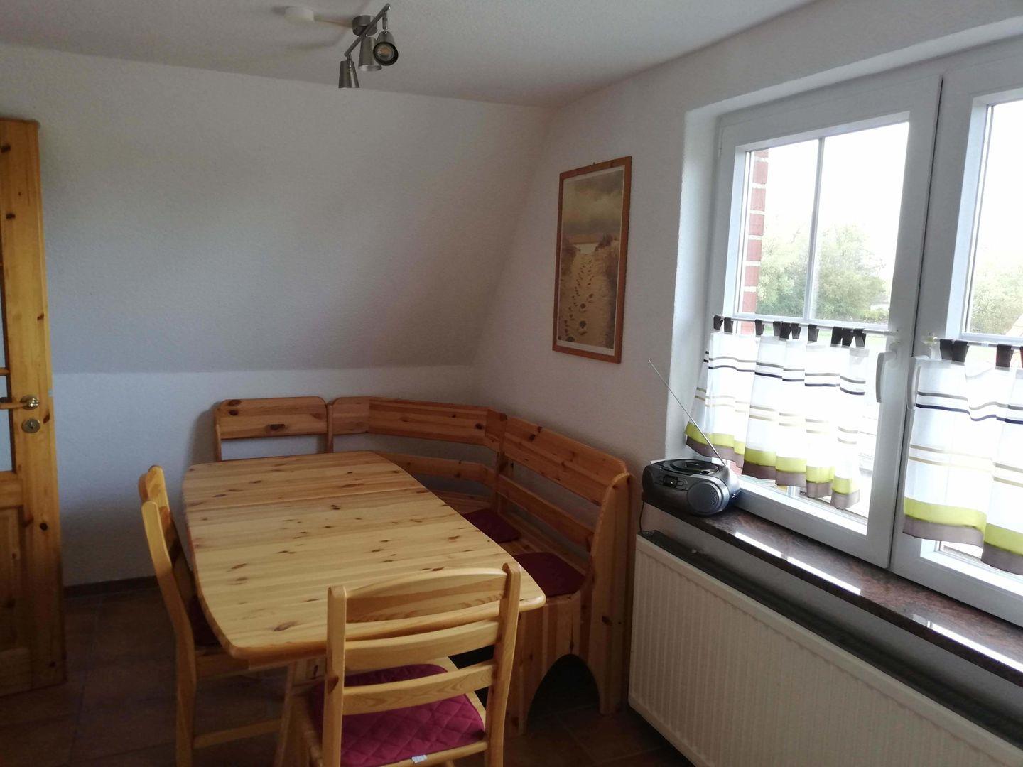 Mit 2 Schlafzimmern, einem gemütlichen Wohnzimmer und einer geräumigen Küche ist alles vorhanden für einen perfekten Familienurlaub. Die Wohnung verfügt über eine Waschmaschine, einen Trockner sowie Bügelbrett und Bügeleisen. Weiterthin besitzt die Wohnung einen gemütlichen Essplatz und im Spitzboden einen "Spielraum" für die Kleinen. Über eine separate Holztreppe gelangen die Kleinen dorthin, wo sie ungestört spielen können.