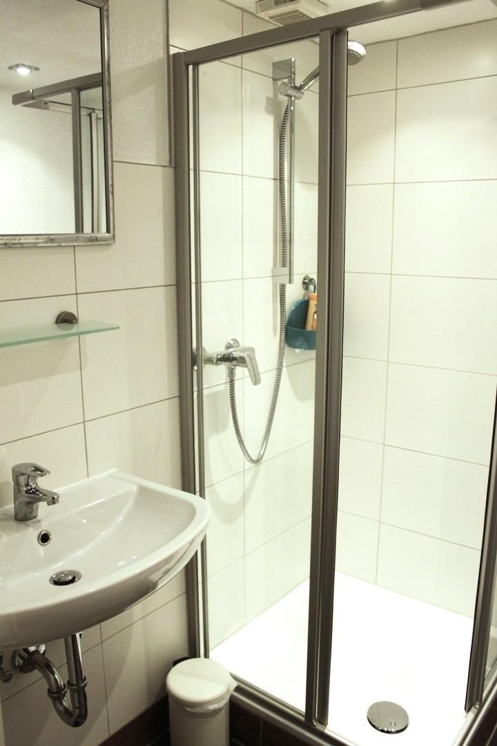 Das helle, geräumige Bad verfügt über eine Duschkabine.