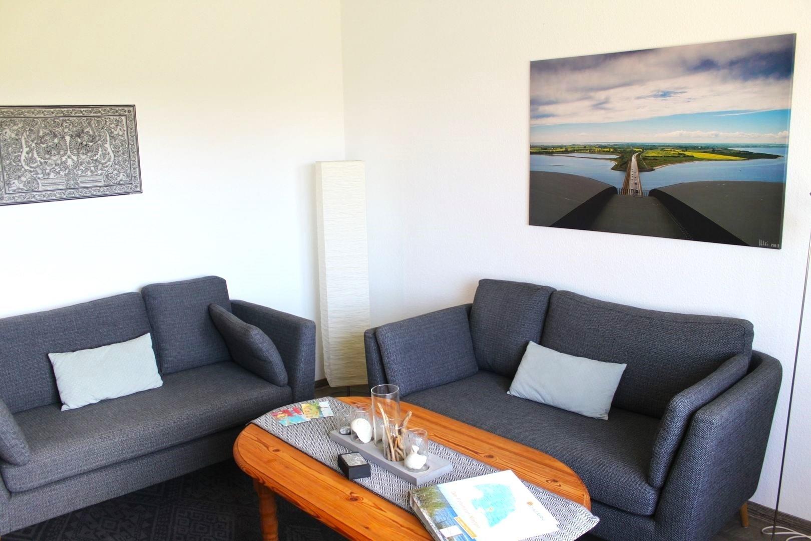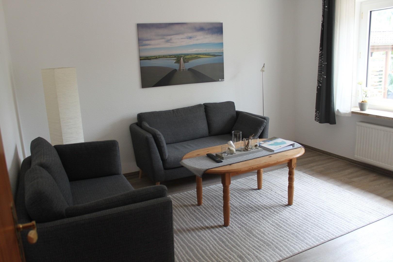 Über den großen Flur gelangen Sie ins helle und moderne Wohnzimmer, welches mit zwei gemütliche Sofas, einem HIFI-LED TV ausgestattet ist..Ebenso erreichen Sie vom Flur aus die Schlafräume ( ein Schlafraum für 2 Personen mit Doppelbett, ein Schlafraum mit Einzelbett ).