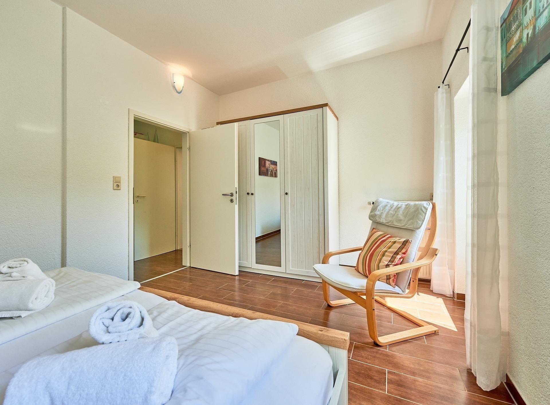 Schlafzimmer 2: 2 Einzelbetten, Kleiderschrank, Verdunkelung: Jalousien