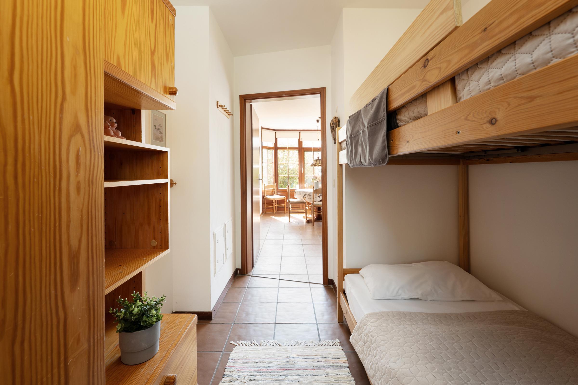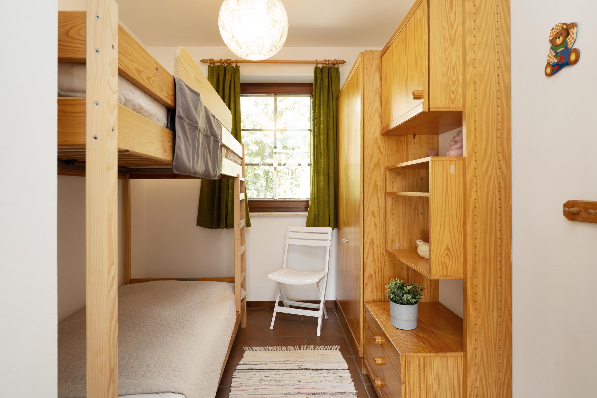 Schlafzimmer: Etagenbett (2x je 90x200 cm), Kleiderschrank, Verdunkelung (Gardinen), kein Platz für Kinderreisebett vorhanden