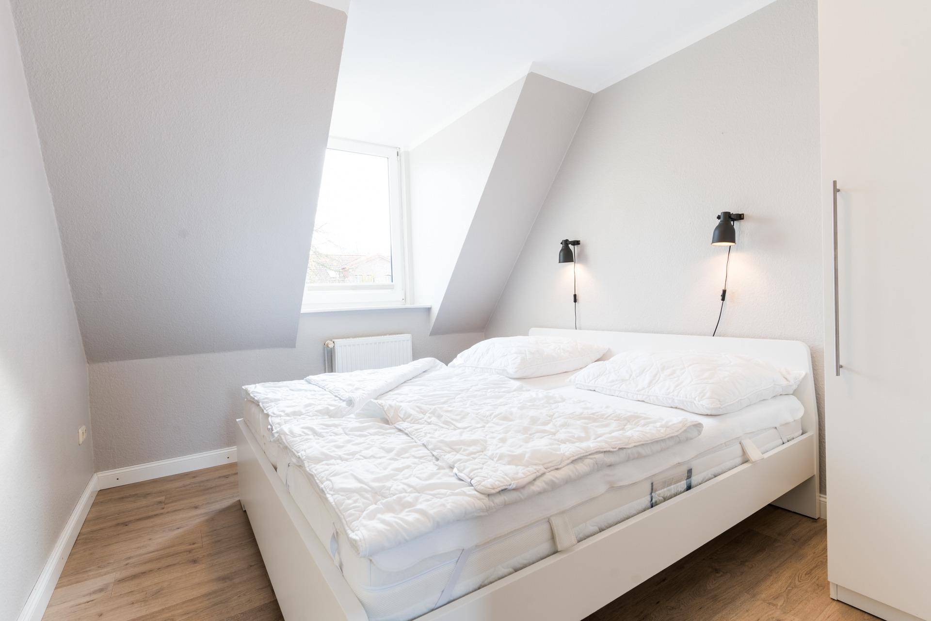 Drei Schlafzimmer mit Doppelbetten ausgestattet befinden sich auf der unteren Ebene, das vierte Schlafzimmer befindet sich im Spitzboden und ist mit einem Doppelbett ausgestattet.