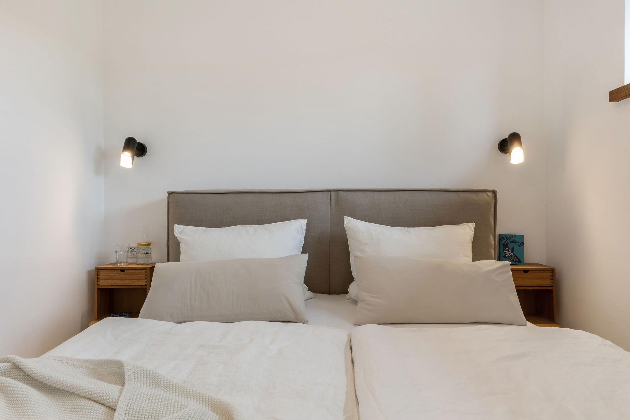 Ihr betretet die Wohnung über die große, offene Diele mit Kleiderschrank, die zum Essbereich und der offenen Küche führt. Hier kocht ihr in einer hochwertigen Nolte-Küche mit Induktionskochfeld und tafelt am Eichenholztisch. Aus der Küche gelangt ihr direkt auf die wunderschöne Sonnenterrasse mit Strandkorb, Sonnenschirm und Gartenmöbeln. Angrenzend an den Koch- und Essbereich befindet sich der gemütliche Wohnbereich mit hochwertigem Bali-Schlafsofa und Smart-TV. Das Schlafzimmer ist mit einem 180x200 cm Polsterbett ausgestattet und hat ein elektrisch zu öffnendes Fenster (abdunkelbar mit elektrischem Rollladen), aus dem ihr in den Himmel schauen könnt. Im Badezimmer genießt ihr die Luxus-Rainshower und natürlich einen Handtuchheizkörper. Die gesamte Wohnung ist mit Fußbodenheizung ausgestattet. Ein besonderes Merkmal ist die imposante Deckenhöhe, die ein tolles Raumgefühl schafft. Unser Haus wurde nachhaltig kernsaniert, hat eine PV- und eine Solarthermieanlage, die die Inselsonne optimal nutzen. Euch steht ein privater Parkplatz auf dem Hof zur Verfügung und weitere Parkmöglichkeiten befinden sich an der Straße. Waschmaschine und Trockner stehen euch außerhalb des Hauses kostenfrei in unserem Waschkeller für Gäste zur Verfügung.