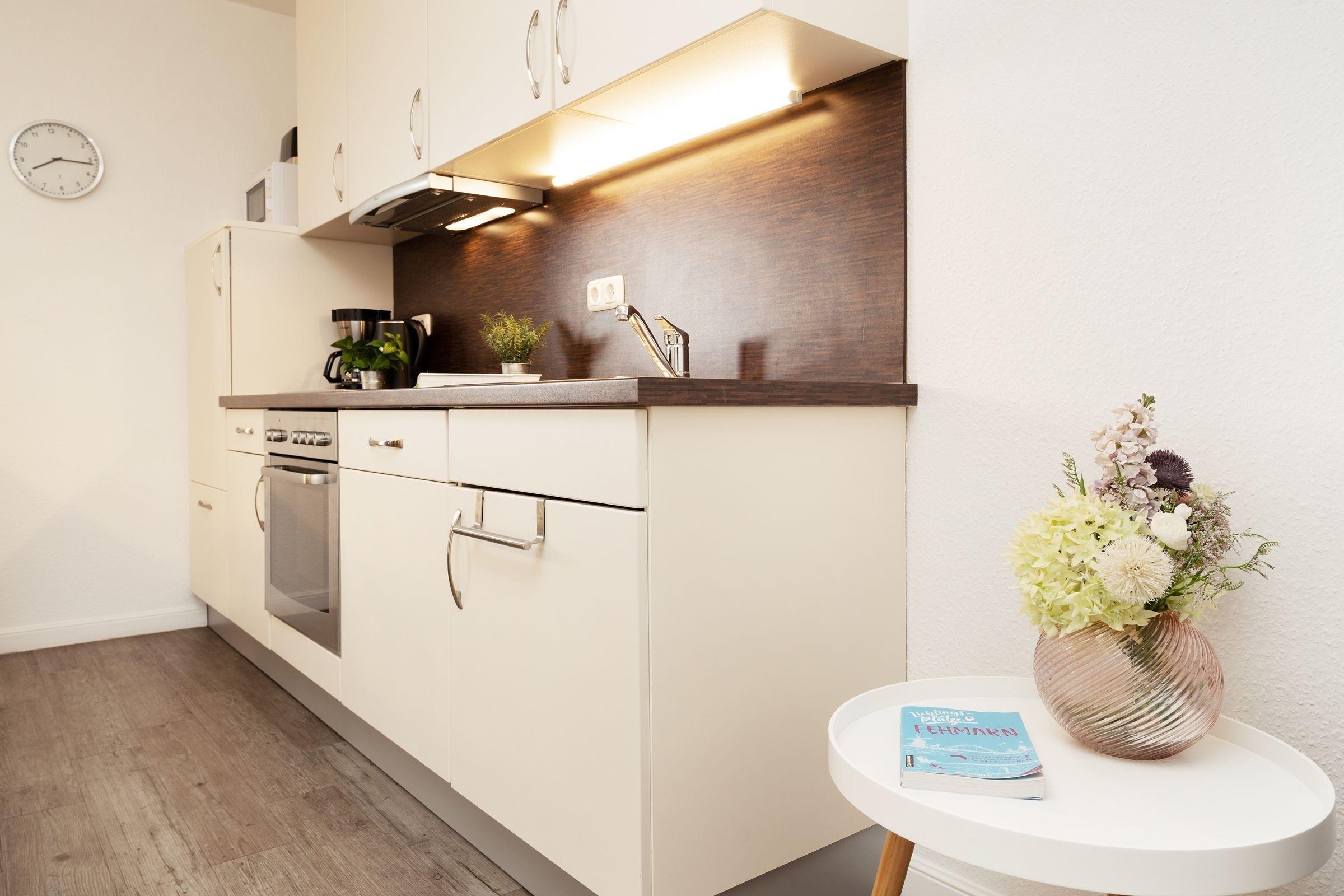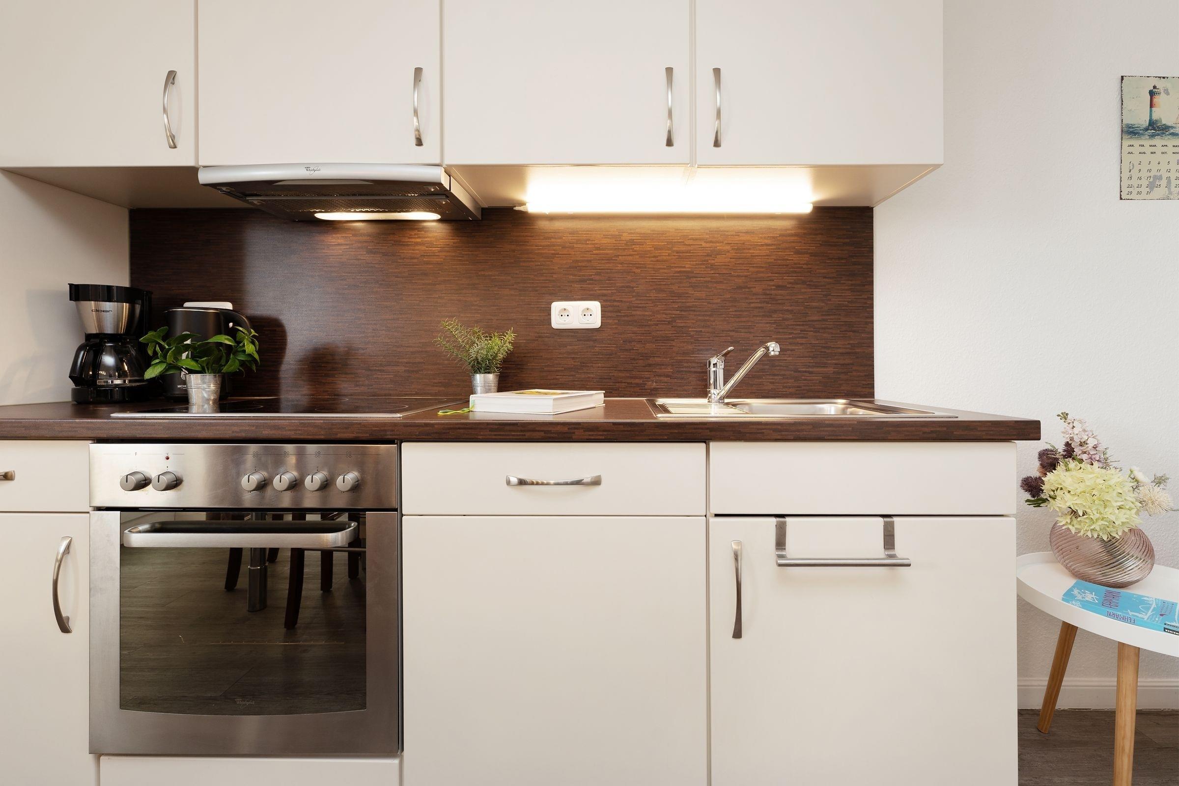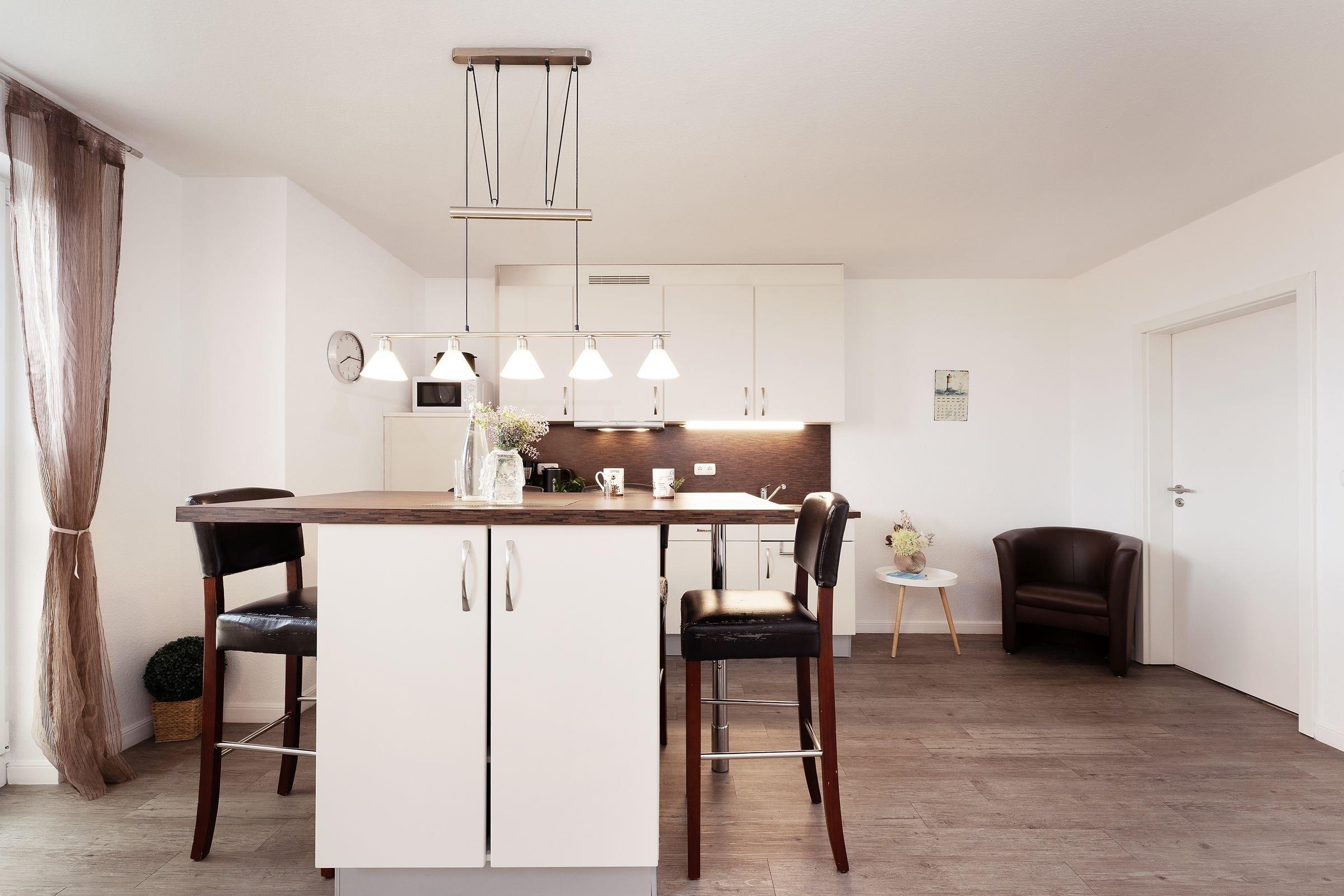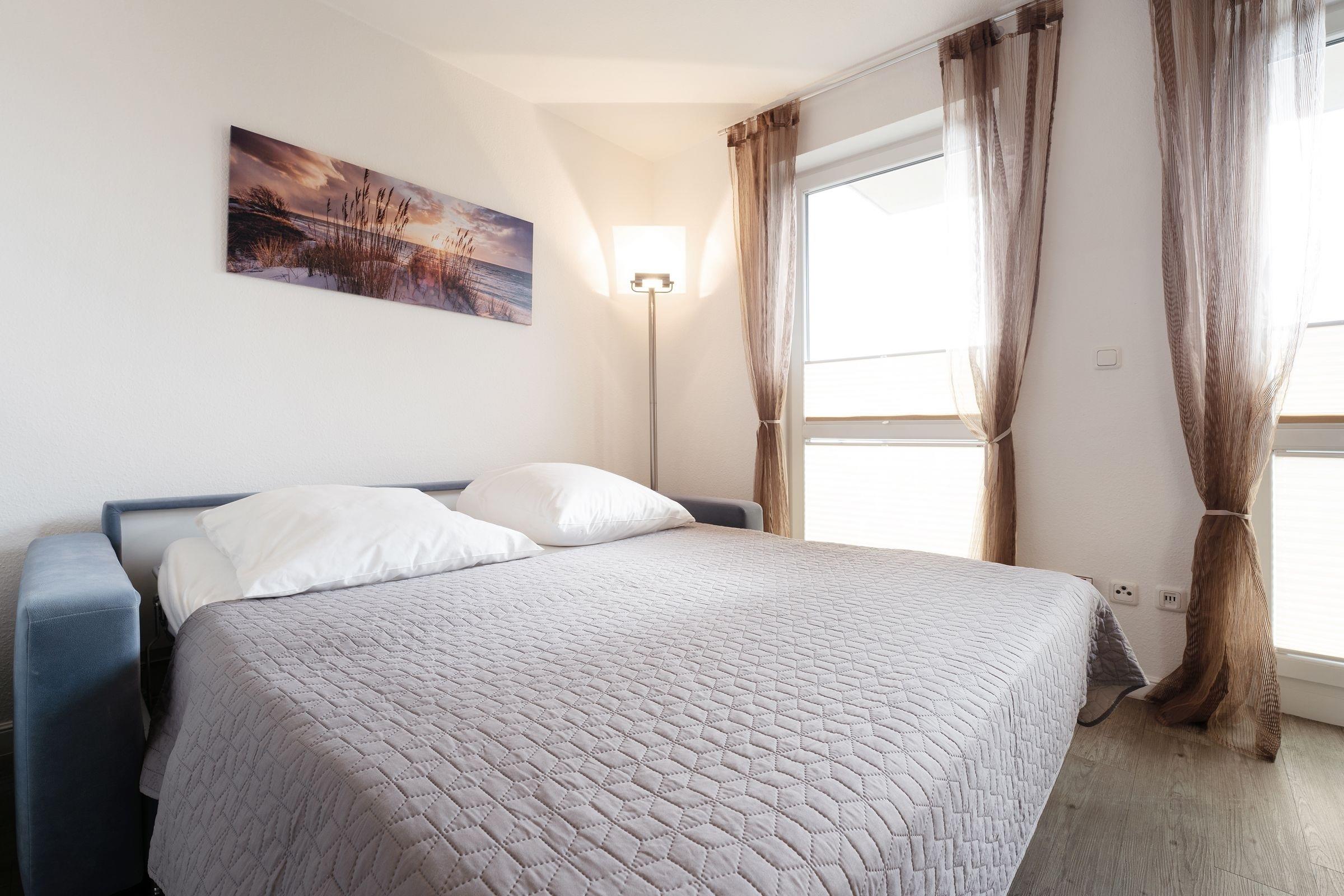 Edel und schick präsentiert sich die Ferienwohnung Ostseebrise. Im hellen Wohnraum erwartet Sie ein Flachbild-TV mit Sat-Anlage, DVD-Player, Radio und CD-Player. Ein komfortables Schlafsofa lässt sich bei Bedarf zum Bett (180 cm breit) umwandeln. Die offene Küche ist gut ausgestattet mit allen Elektrogeräten und Utensilien, die Sie beim entspannten Kochen brauchen. Am Küchentresen finden vier Personen auf gemütlichen Barhockern Platz. Vom möblierten Balkon können Sie den Meerblick und die gute Seeluft genießen. Das separate Schlafzimmer mit Doppelbett verspricht traumhafte Nächte. Das moderne, tageslichthelle Duschbad verfügt über einen Handtuchheizkörper sowie Fußbodenheizung.
