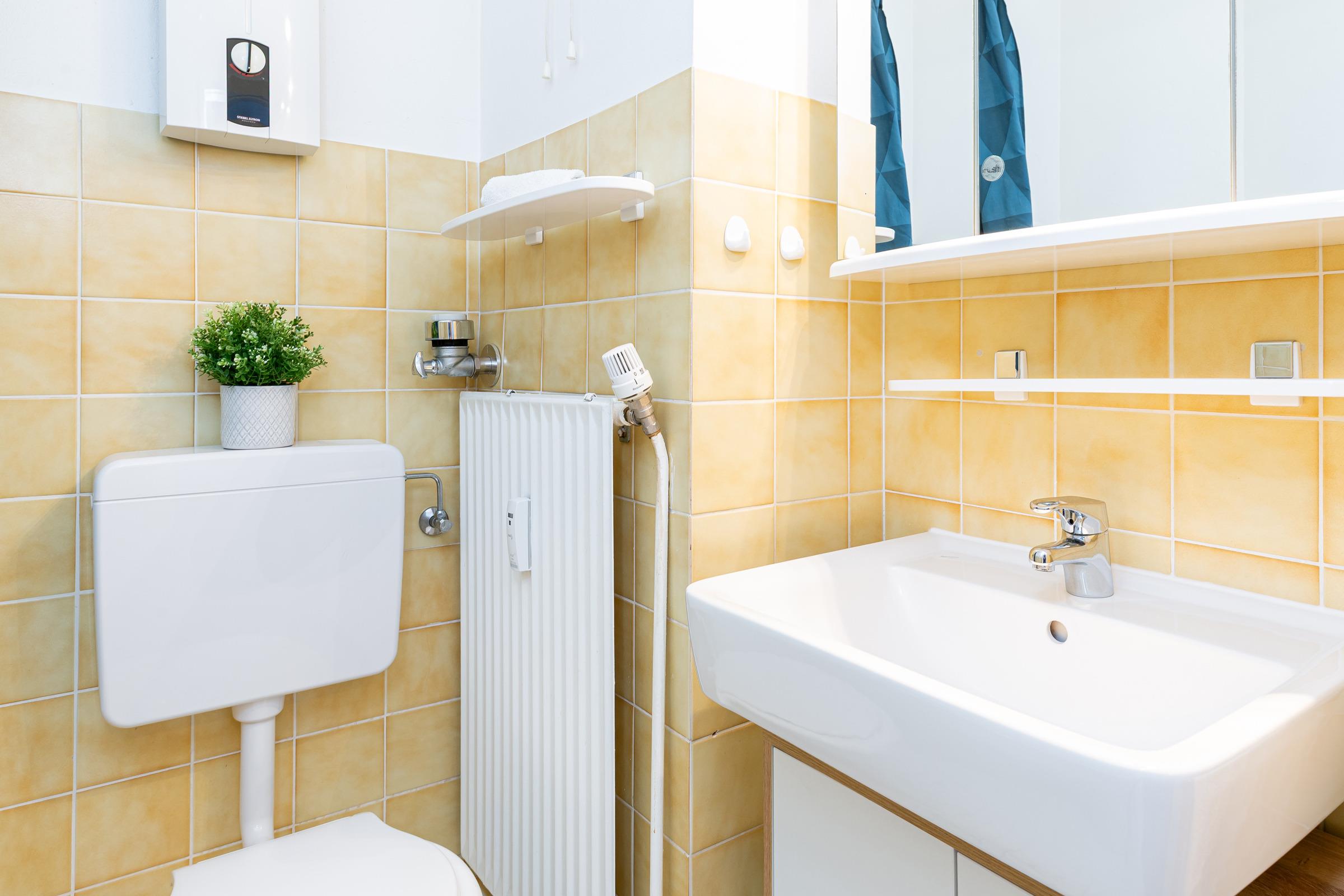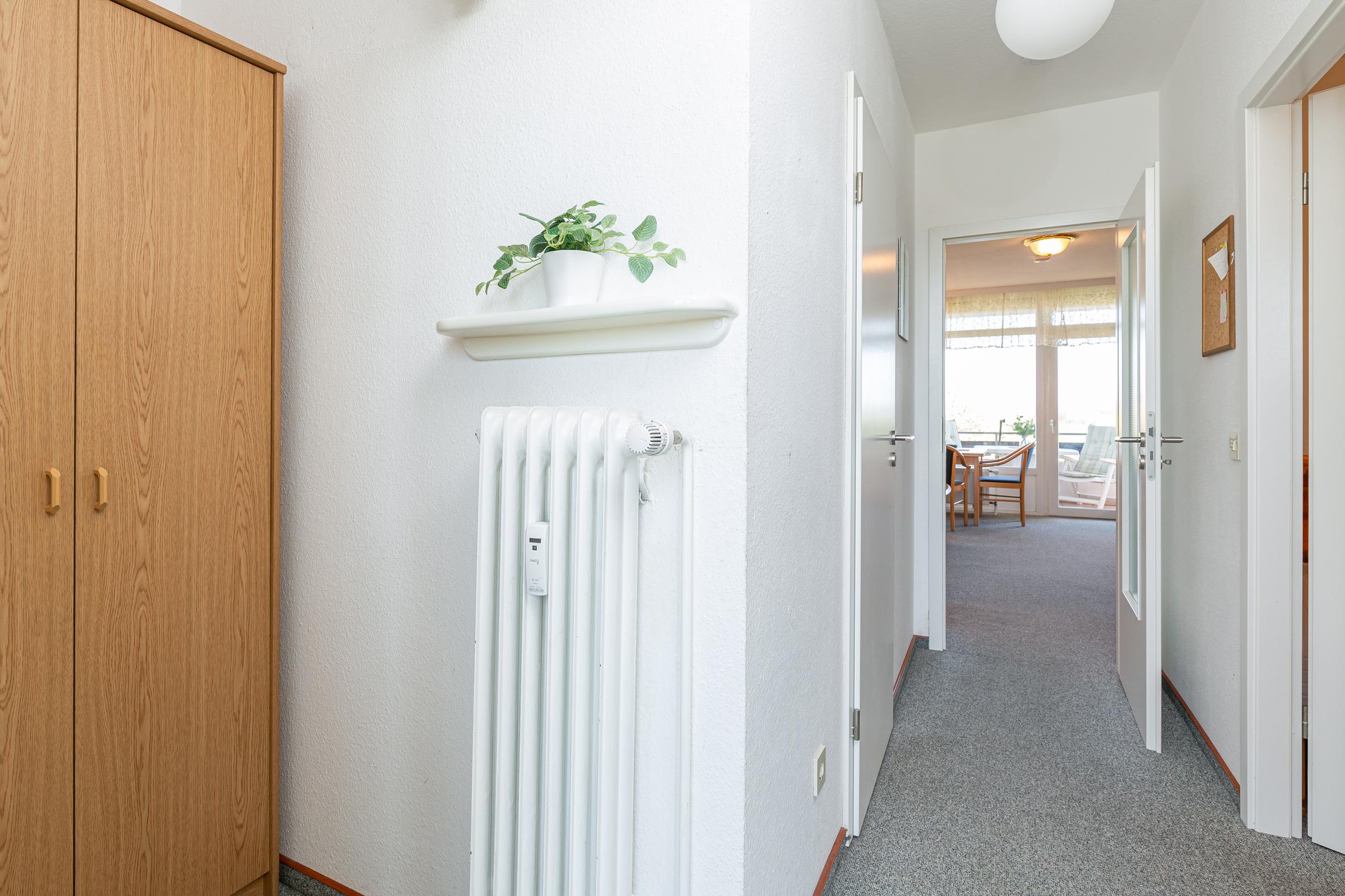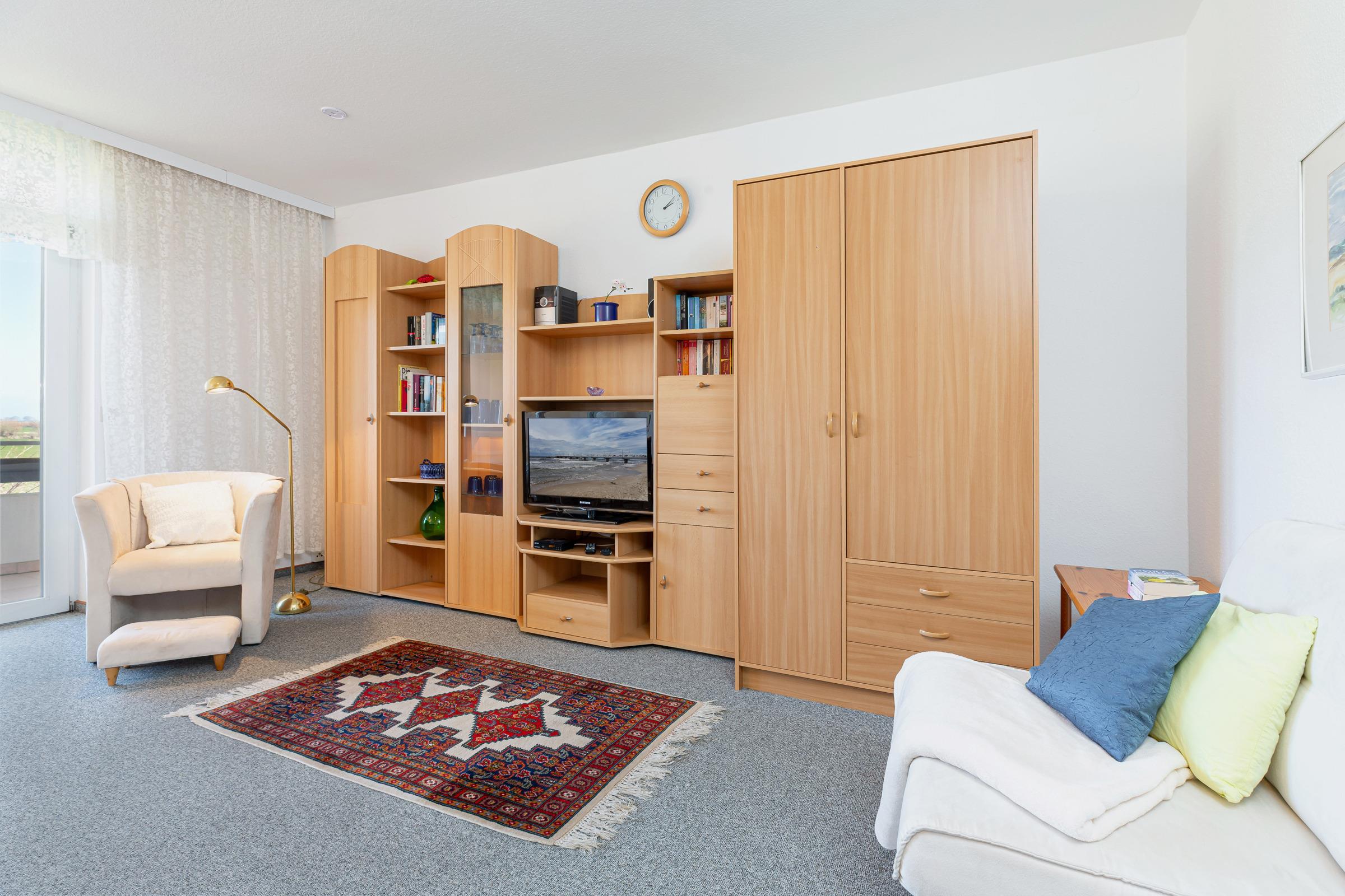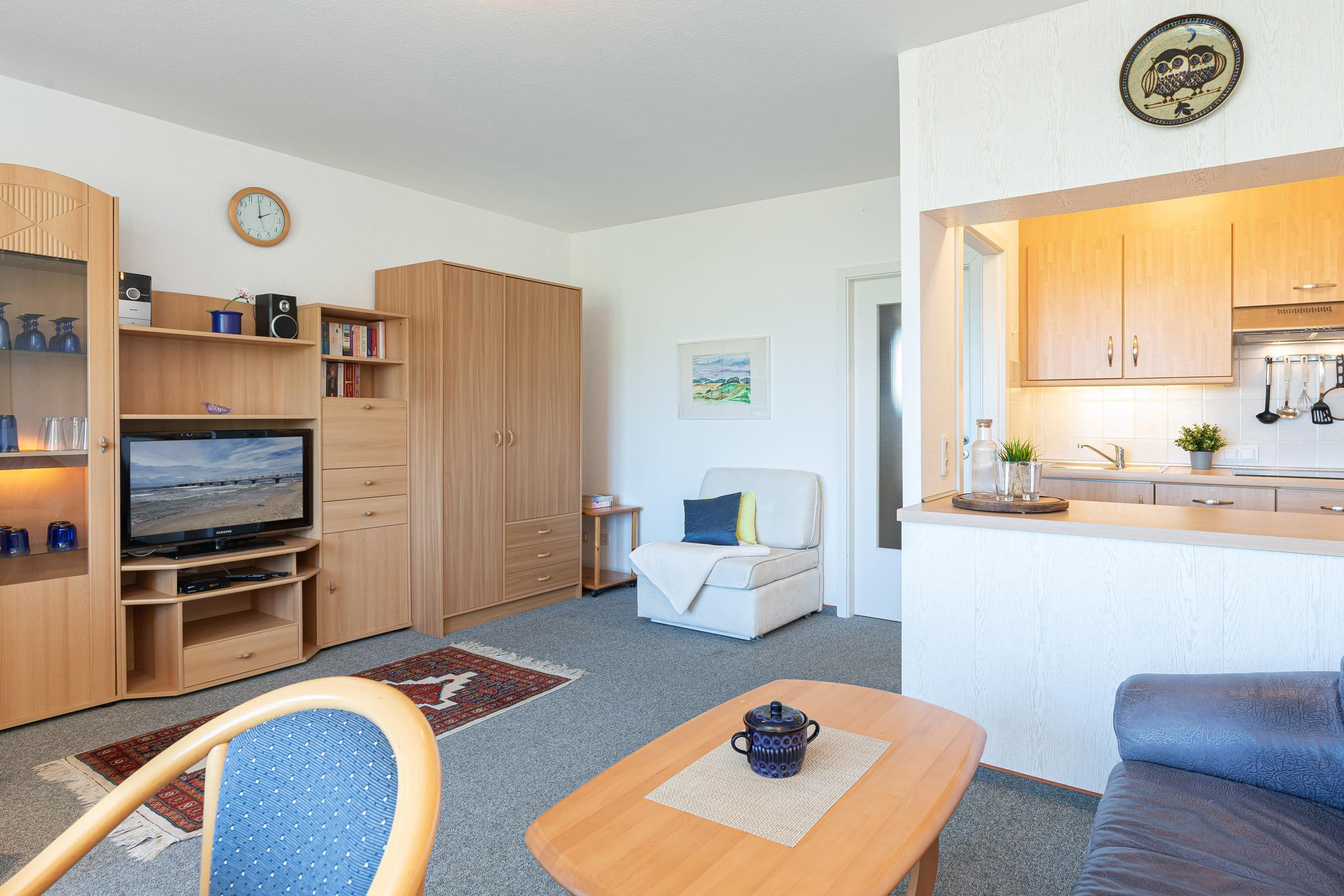 Die Wohnung liegt nur rund 100 Meter von der Ostsee entfernt und ist gemütlich eingerichtet. Aus dem Wohnzimmer mit Sofa und Essecke sowie vom möblierten Balkon aus haben Sie einen tollen Blick aufs Meer. Sollte es hier draußen die Sonne einmal zu gut mit Ihnen meinen, schützt Sie ein Sonnenschirm. Die offene Küche ist gut ausgestattet und ermöglicht eine angenehme Selbstverpflegung. Das Schlafzimmer ist mit zwei Einzelbetten (je 90x190 cm) ausgestattet. Im Wohnzimmer steht ein zusätzlicher Schlafsessel (80x190 cm) zur Verfügung. Rollläden im Wohn- und Schlafzimmer sorgen für Verdunkelung und einen erholsamen Schlaf. Das innenliegende Bad mit Wanne (mit Duschvorhang) sorgt für Erfrischung am Morgen.
