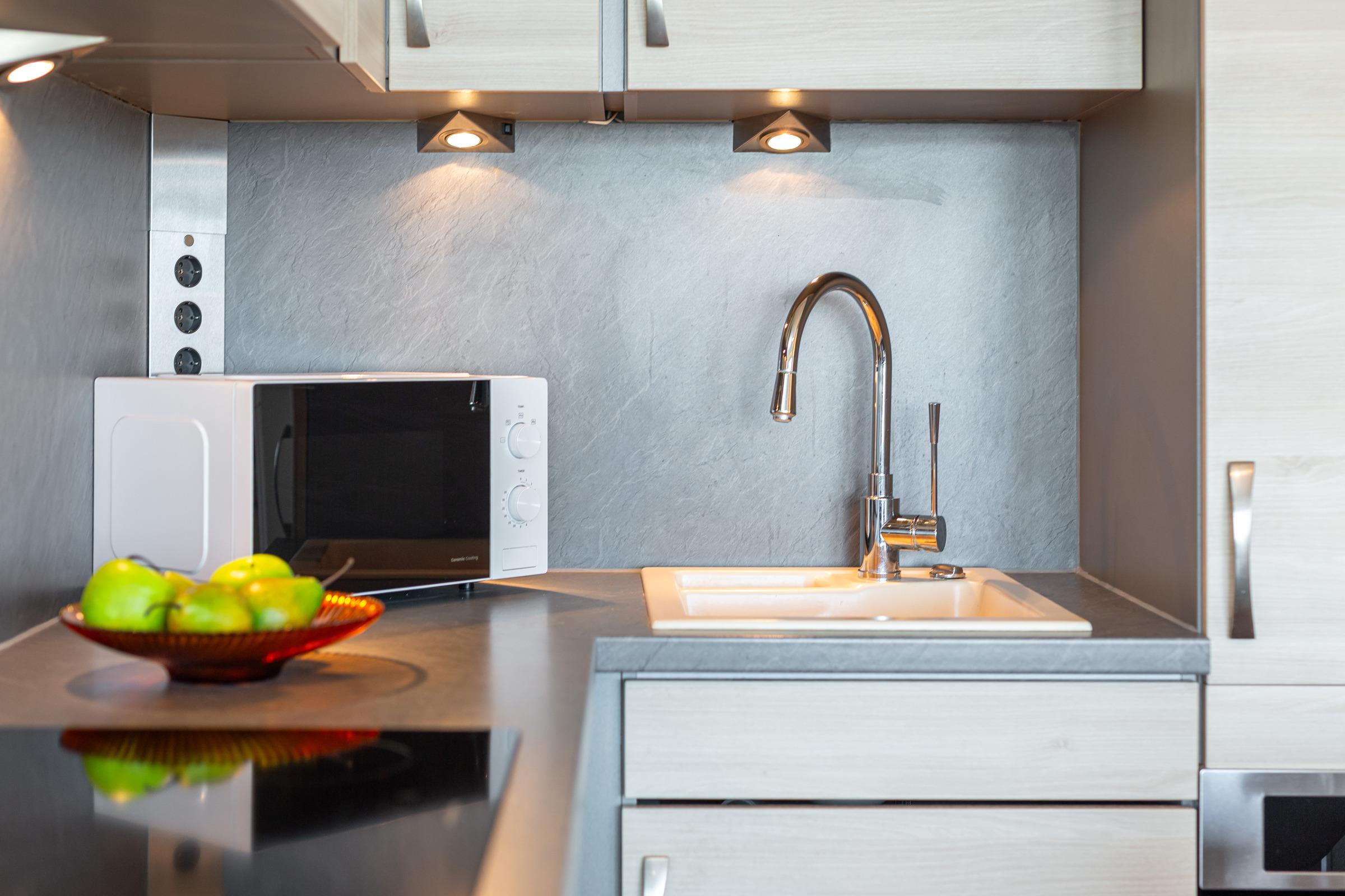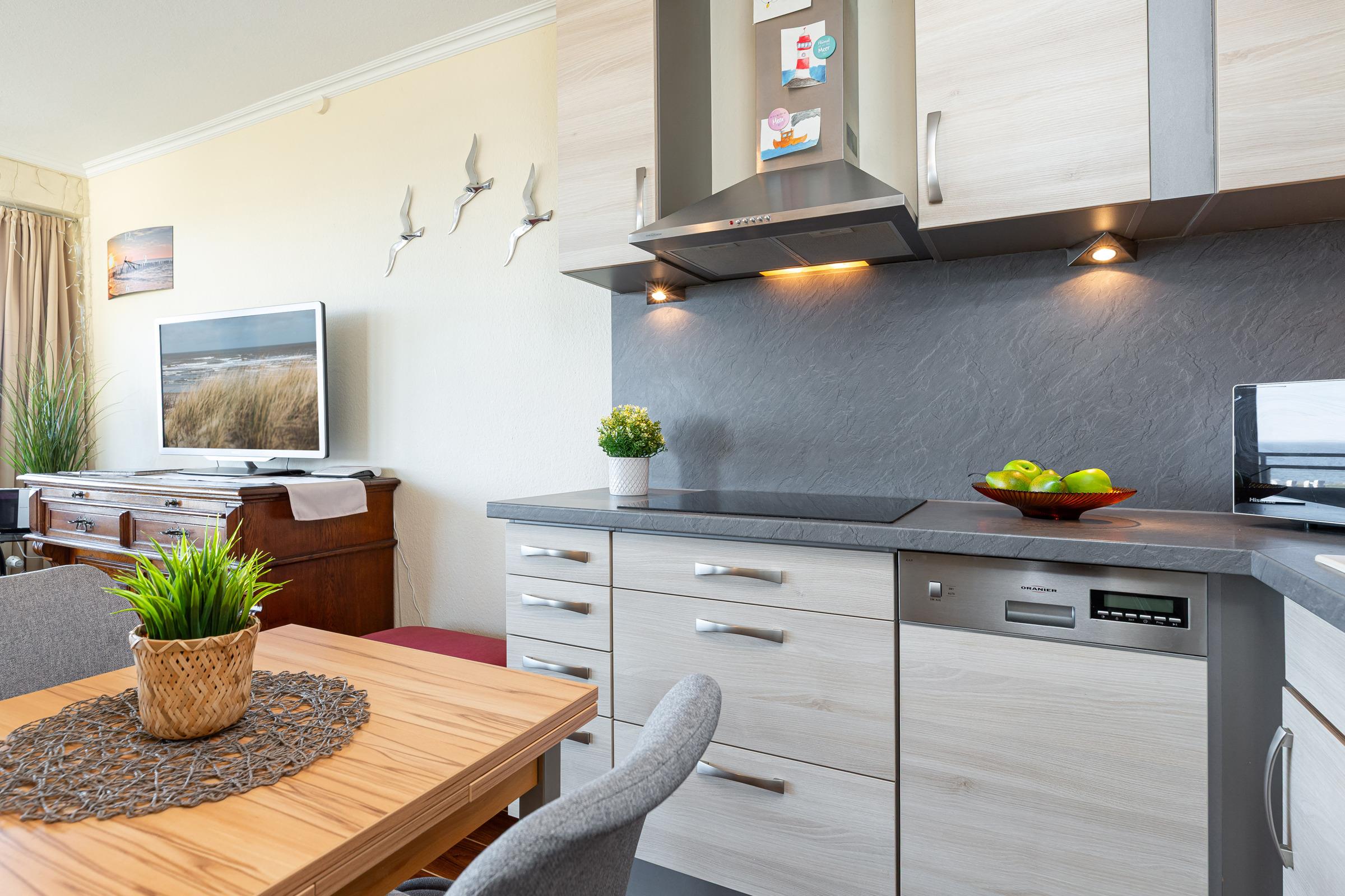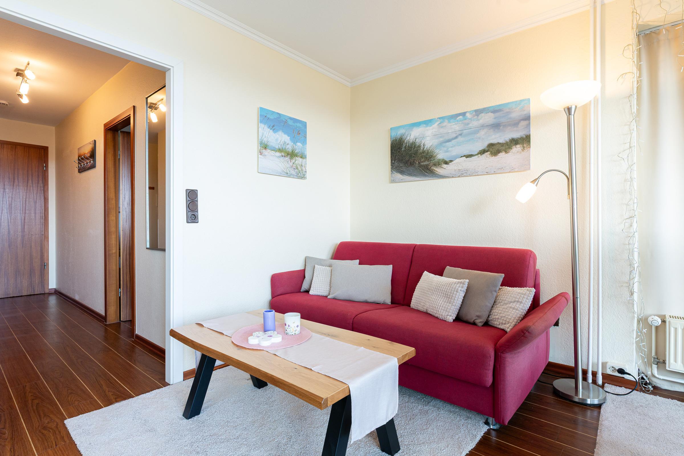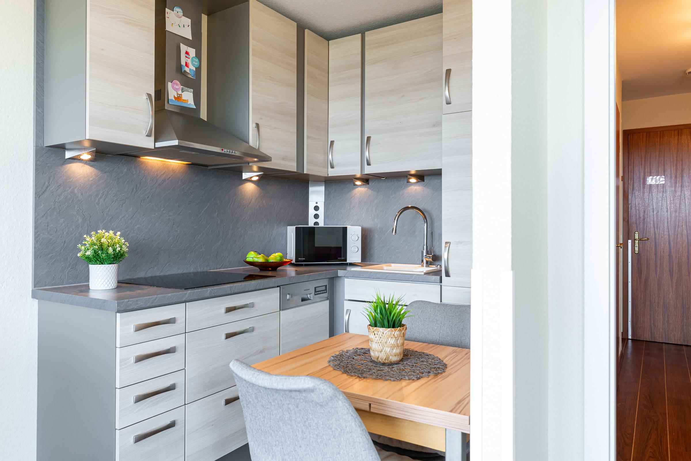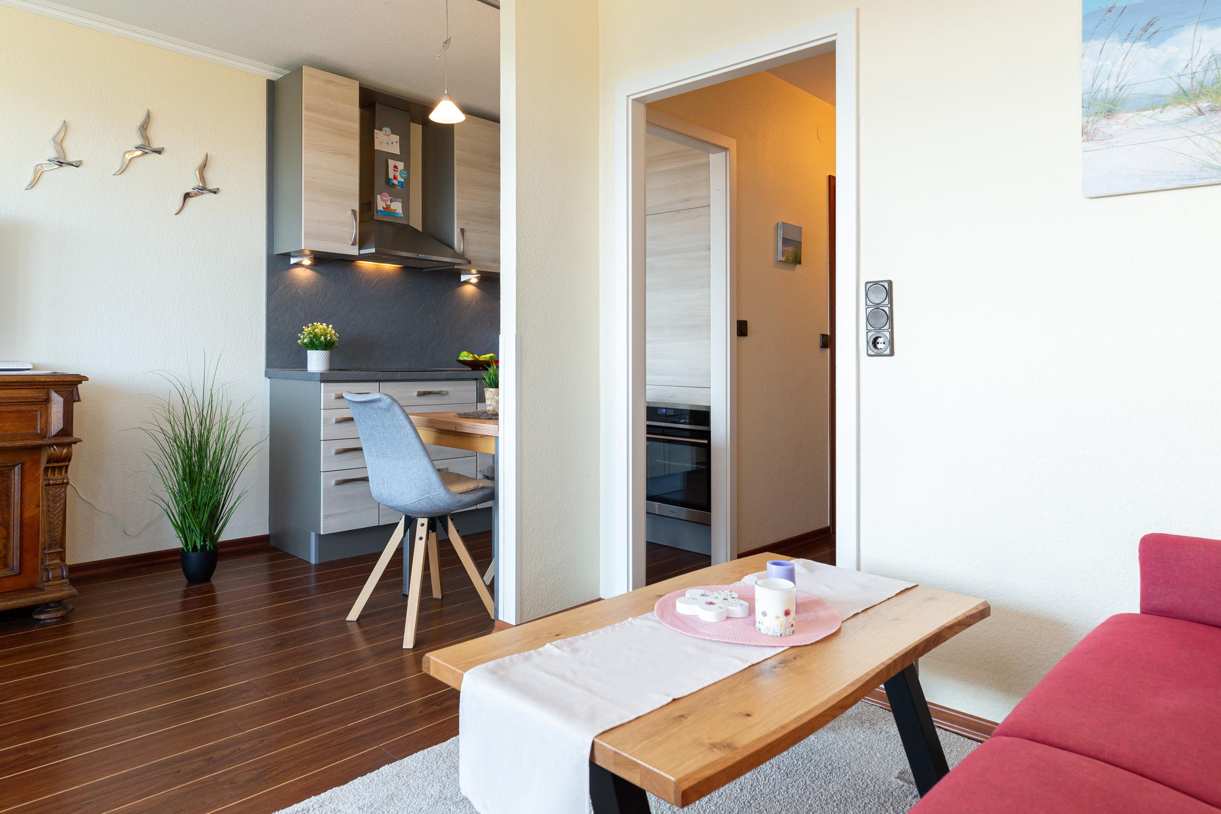 Die moderne, sehr gut ausgestattete Küche lädt zum gemeinsamen Kochen ein. Als Schlafmöglichkeit dienen ein Doppelbett im separaten Schlafzimmer sowie ein Schlafsofa im Wohnzimmer. Im hell gefliesten Badezimmer starten Sie erfrischt in den neuen Tag. Der Strand befindet sich nur zwei Gehminuten vom Haus entfernt und wird ohne das Überqueren einer Straße erreicht. So ist der Weg zum erfrischenden Bad in der Ostsee mit Kindern jeden Alters leicht zu bewerkstelligen. Der Strand wird nur von den Bewohnern der Ferienresidenz genutzt, sodass es ausreichend Platz für jeden Strandbesucher gibt.