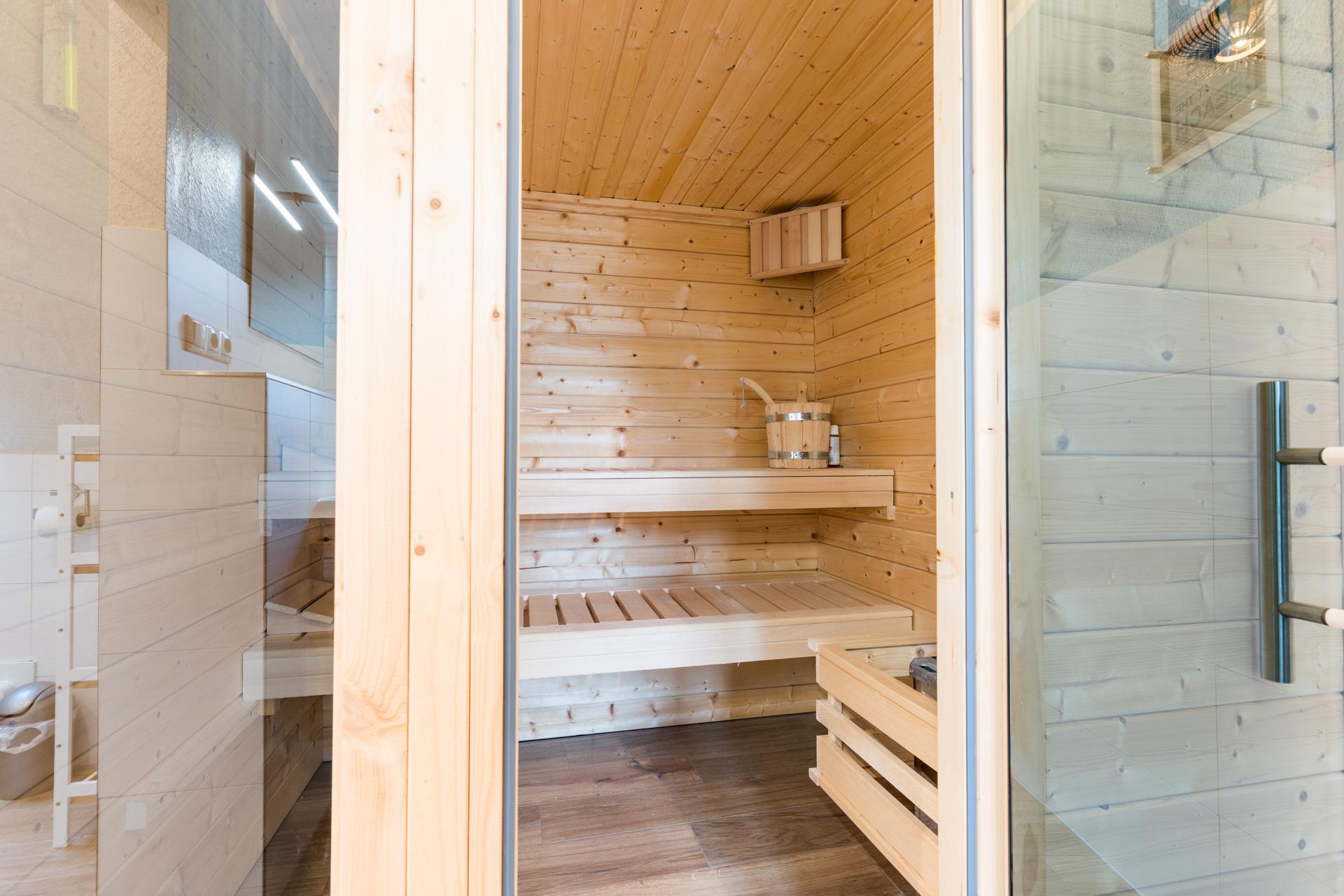 Zur Wohnung gehören außerdem ein Duschbad mit Sauna und ein Gäste-WC sowie eine Waschmaschine.