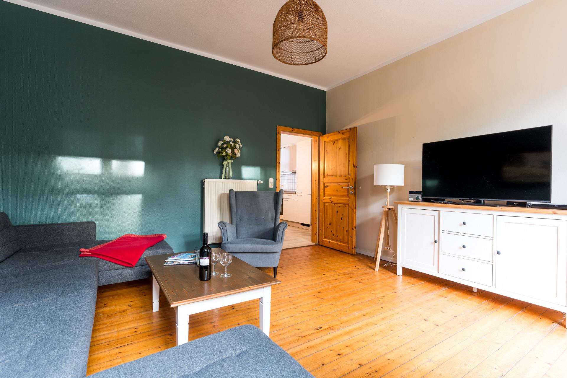Im lichtdurchfluteten Wohnzimmer erwarten Sie ein Flachbild-TV mit DVD-Player, ein Radio und ein CD-Player.