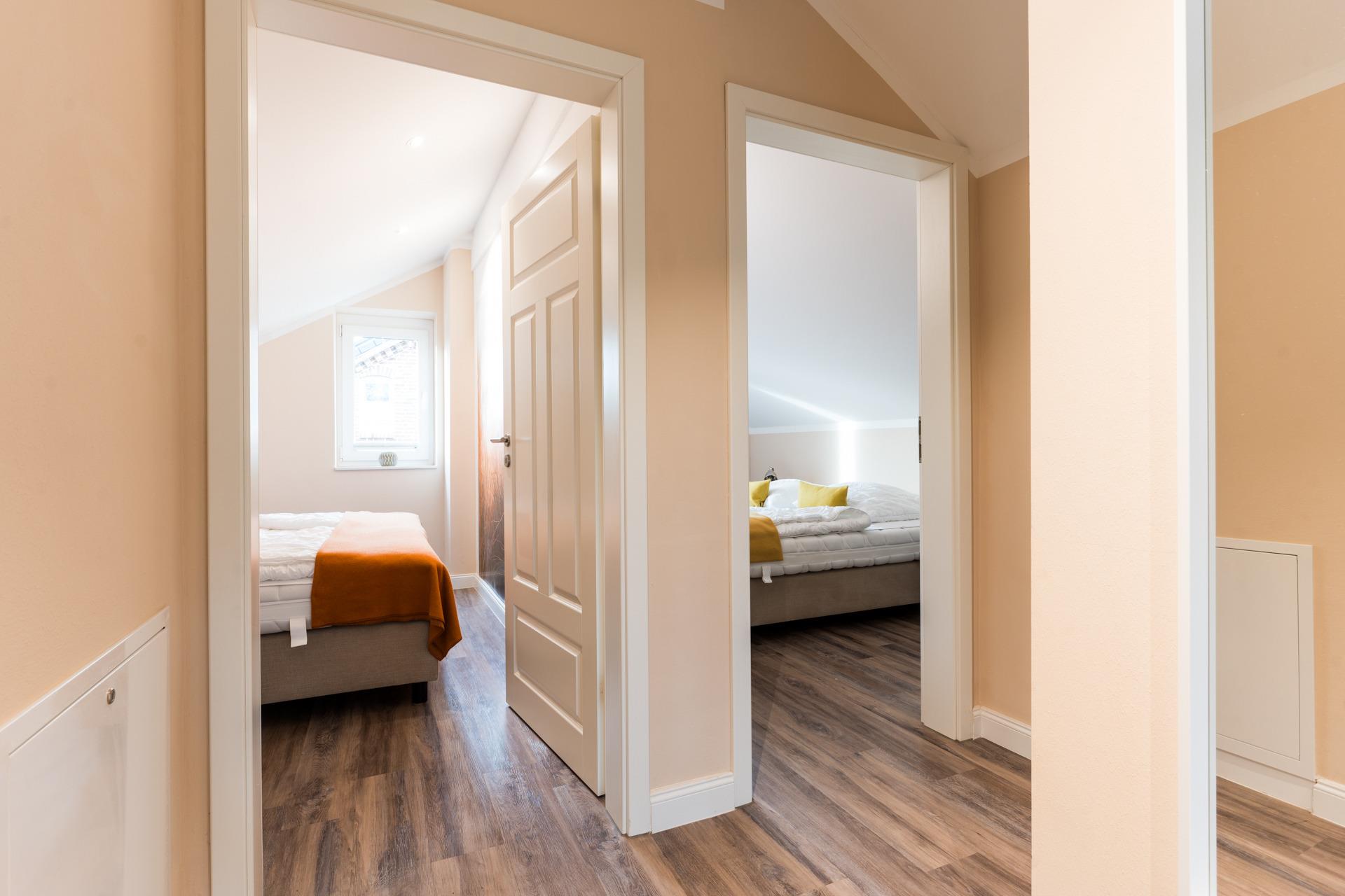Sie liegen alle im Obergeschoss und sind mit Doppelbetten ausgestattet.
