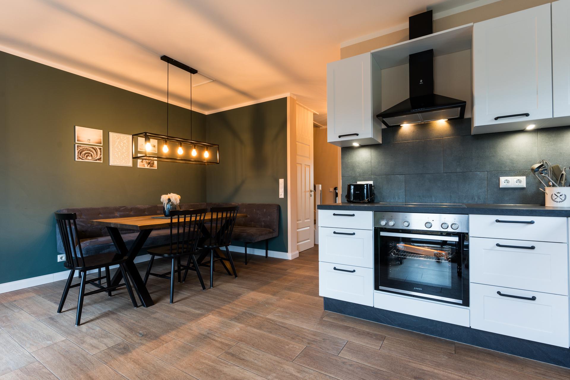 Die hochwertige Wohnküche ist komplett ausgestattet mit allen Geräten und Utensilien, die Sie benötigen.