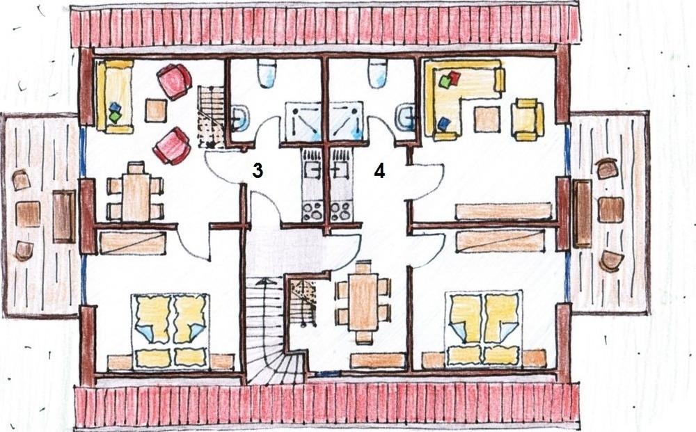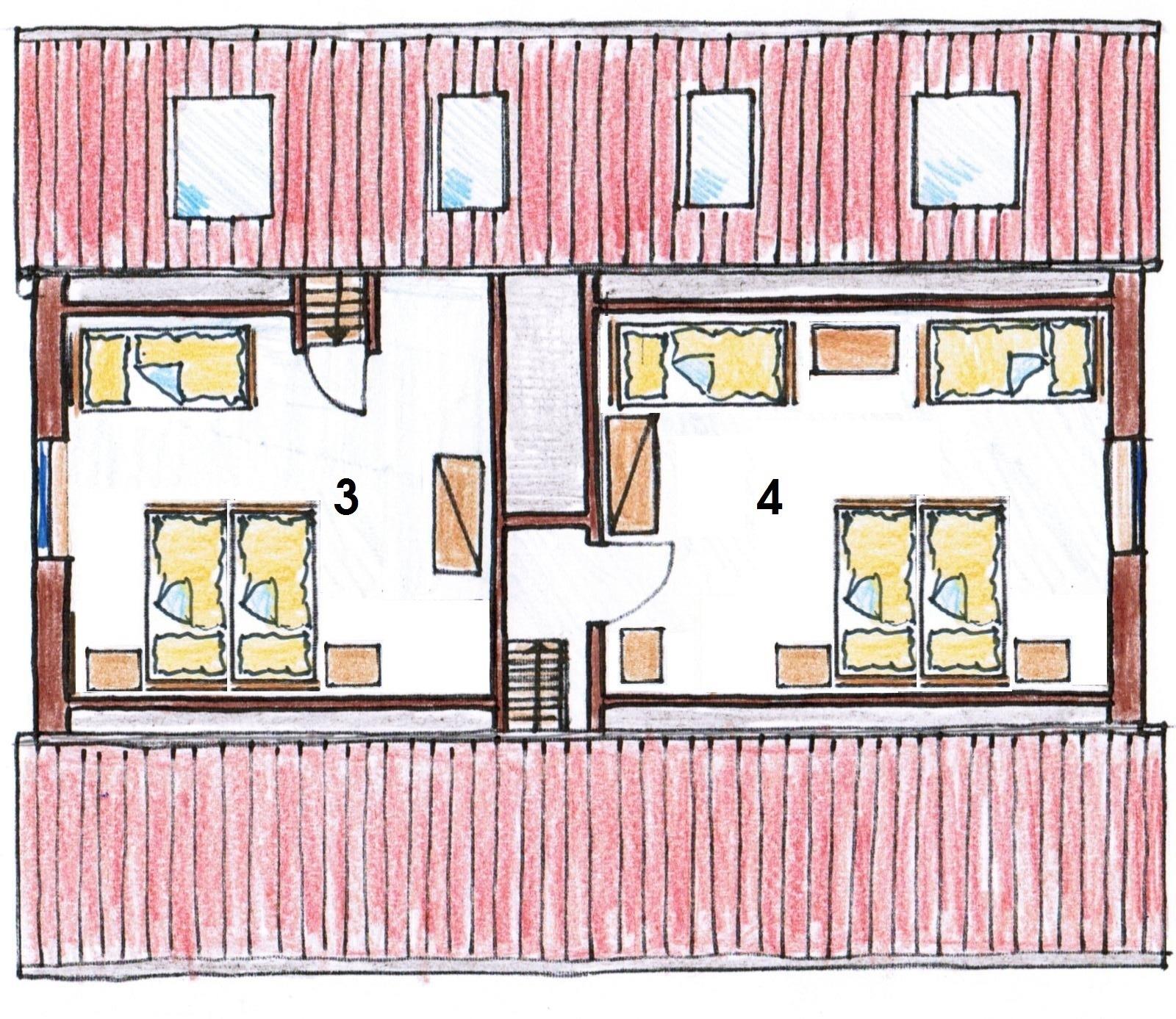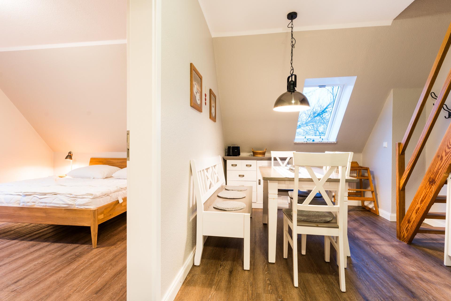 Ein Schlafzimmer ist mit 1 Doppelbett ausgestattet, das Schlafzimmer im Dachgeschoss mit 1 Doppelbett und 2 Einzelbetten. Die Treppe zum Dachgeschoss ist relativ steil, daher empfehlen wir, für kleine Kinder das untere Schlafzimmer zu nutzen.