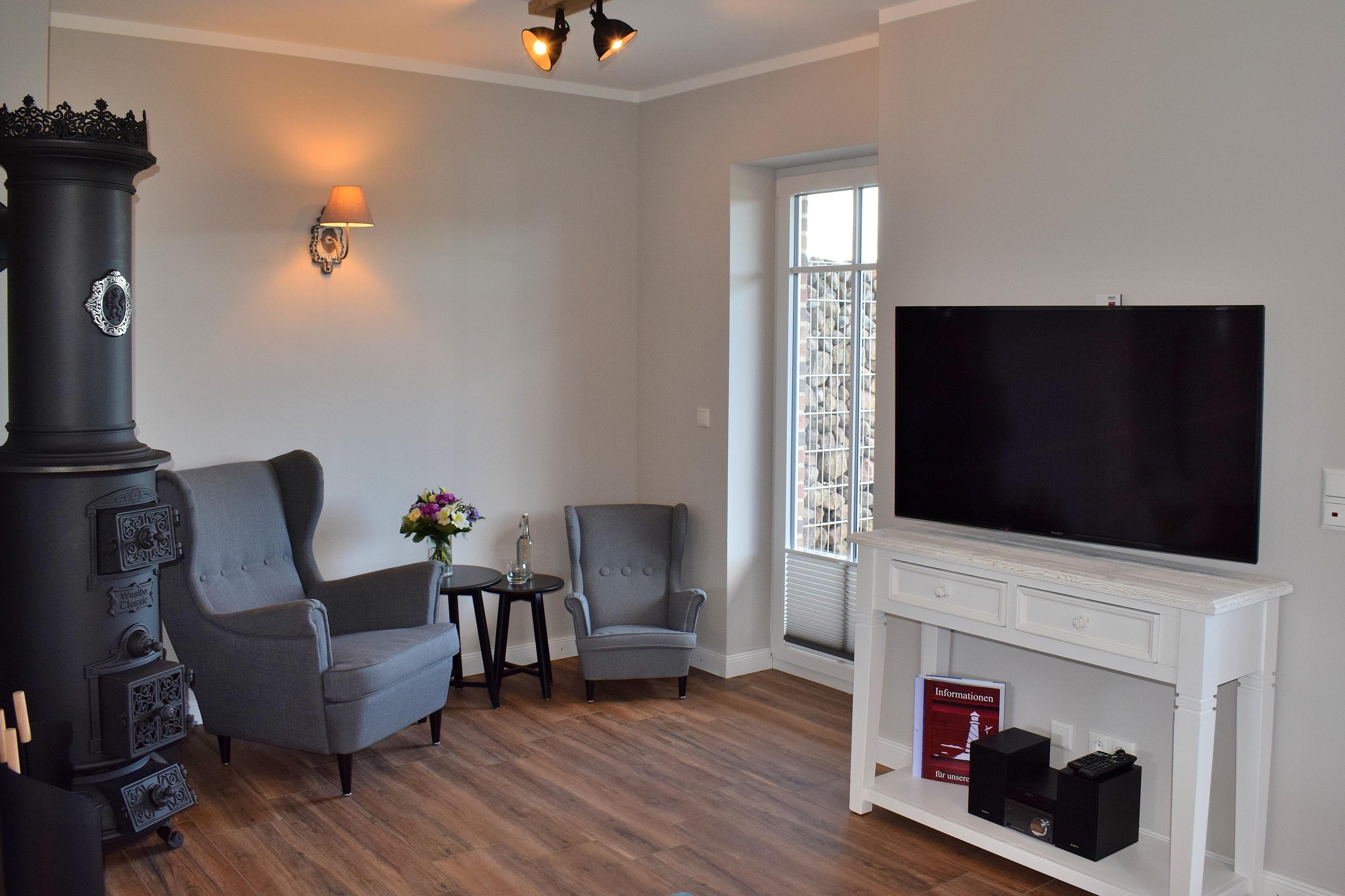 Im großzügigen Wohn-Esszimmer mit Kaminofen erwarten Sie ein Flachbid-TV mit DVD-Player, ein Radio und ein CD-Player.