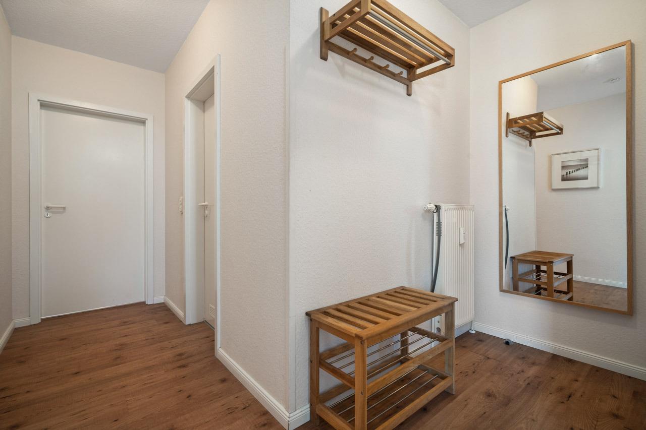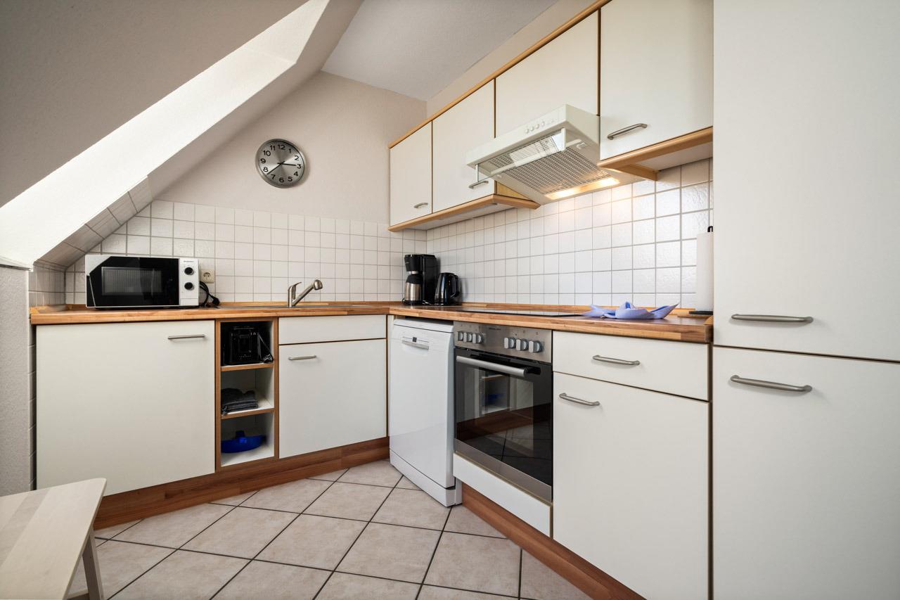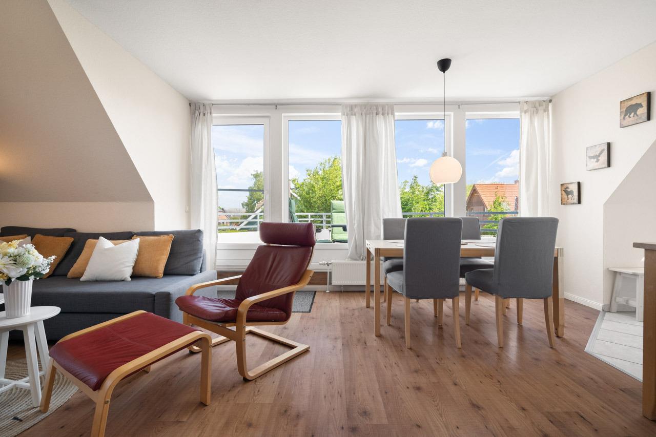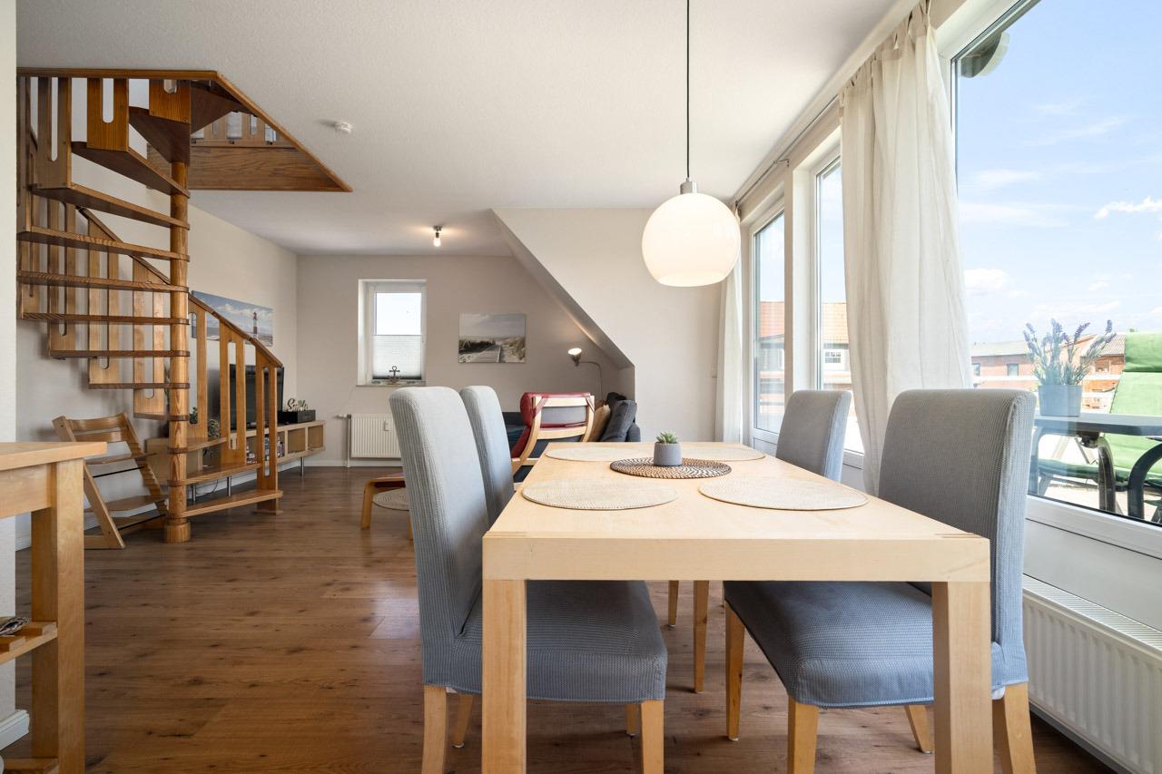 Einen unvergesslichen Urlaub verspricht diese wundervolle Wohnung. In der gemütlichen Sofaecke mit TV-Gerät im Wohnbereich können Sie wunderbar entspannen. Bei schönen Wetter geht es natürlich raus auf den möblierten Balkon in Ost-Ausrichtung, hier können Sie schön windgeschützt die Sonne genießen. Der lichtdurchflutete Essbereich mit angrenzender, sehr gut ausgestatteter Küche laden zum gemeinsamen Kochen ein. Ein Schlafzimmer mit Doppelbett und Lampe mit Bluetooth-Speaker befindet sich über dem Wohnbereich. Ein separates weiteres Schlafzimmer mit zwei zusammen gestellten Einzelbetten steht Ihnen im 1. Stock zur Verfügung. Der Wohnbereich und das separate Schlafzimmer sind über einen Flur verbunden, von welchem auch das hell geflieste Badezimmer abgeht. Starten Sie von der Wohnung aus Fahrradtouren oder genießen Sie einfach die ruhige Umgebung auf dem sonnigen Balkon. Der Strand von Strukkamp ist auch nur wenige Gehminuten von der Wohnung entfernt und lädt zum Schwimmen, Kiten, Windsurfen und Entspannen ein. Abends können Sie dort traumhafte Sonnenuntergänge am Strand genießen und den schönen Urlaubstag ausklingen lassen.