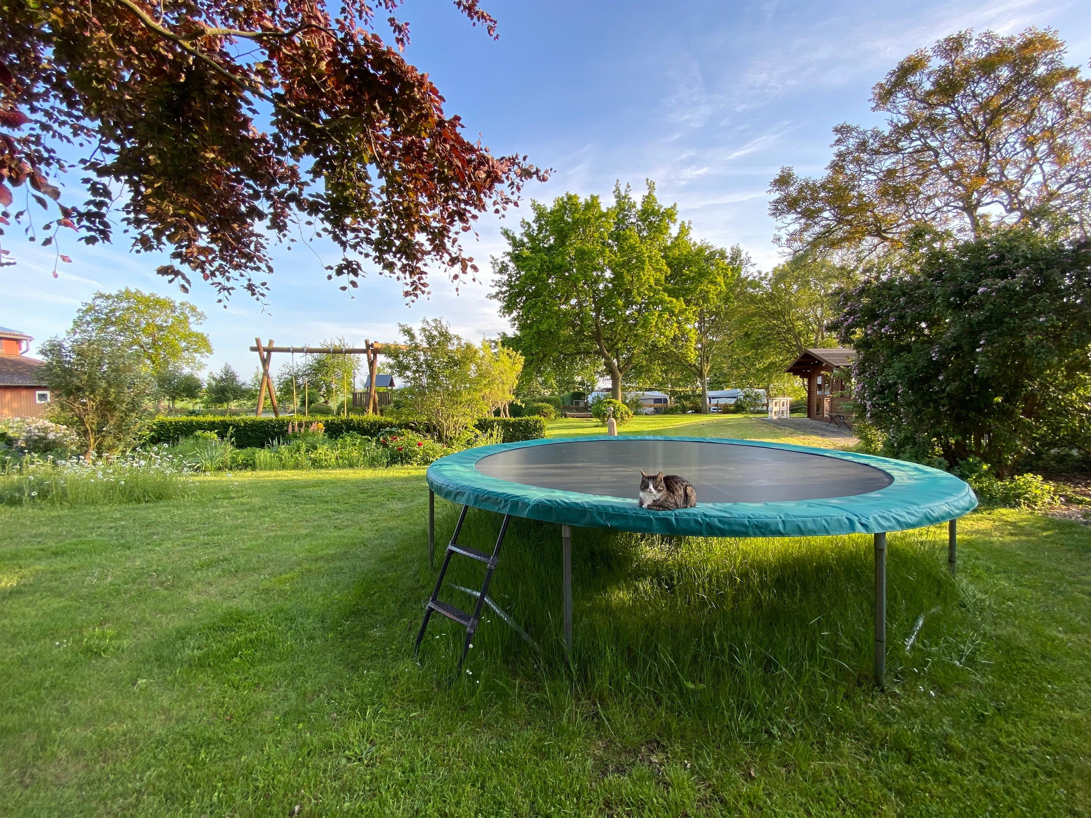 Der Hof bietet viel Platz für Erholung: In unserem großzügig angelegten Bauerngarten mit Strandkorb, Sitzecken und Liegewiese findet jeder seinen Lieblingsplatz. Haben Sie den Willen zum Grillen – kein Problem. Für die jüngsten Gäste gibt es viel zu entdecken: ein spannender Spielplatz mit Tischtennis, das große Trampolin, Holzpferdchen zum Üben und natürlich unsere verschmuste Katze Lucy. Früh am Morgen sind unsere fleißigen Hühner unterwegs , dann schläft unsere kleine Skudden-Herde noch. Gemeinsam füttern wir die Tiere und entdecken den Hof. An drei Tagen in der Woche bieten wir unseren Gästen ein bauernhofpädagogisches Programm, u.a. wird Marmelade gekocht, Stockbrot gebacken und mit Schafwolle gefilzt.