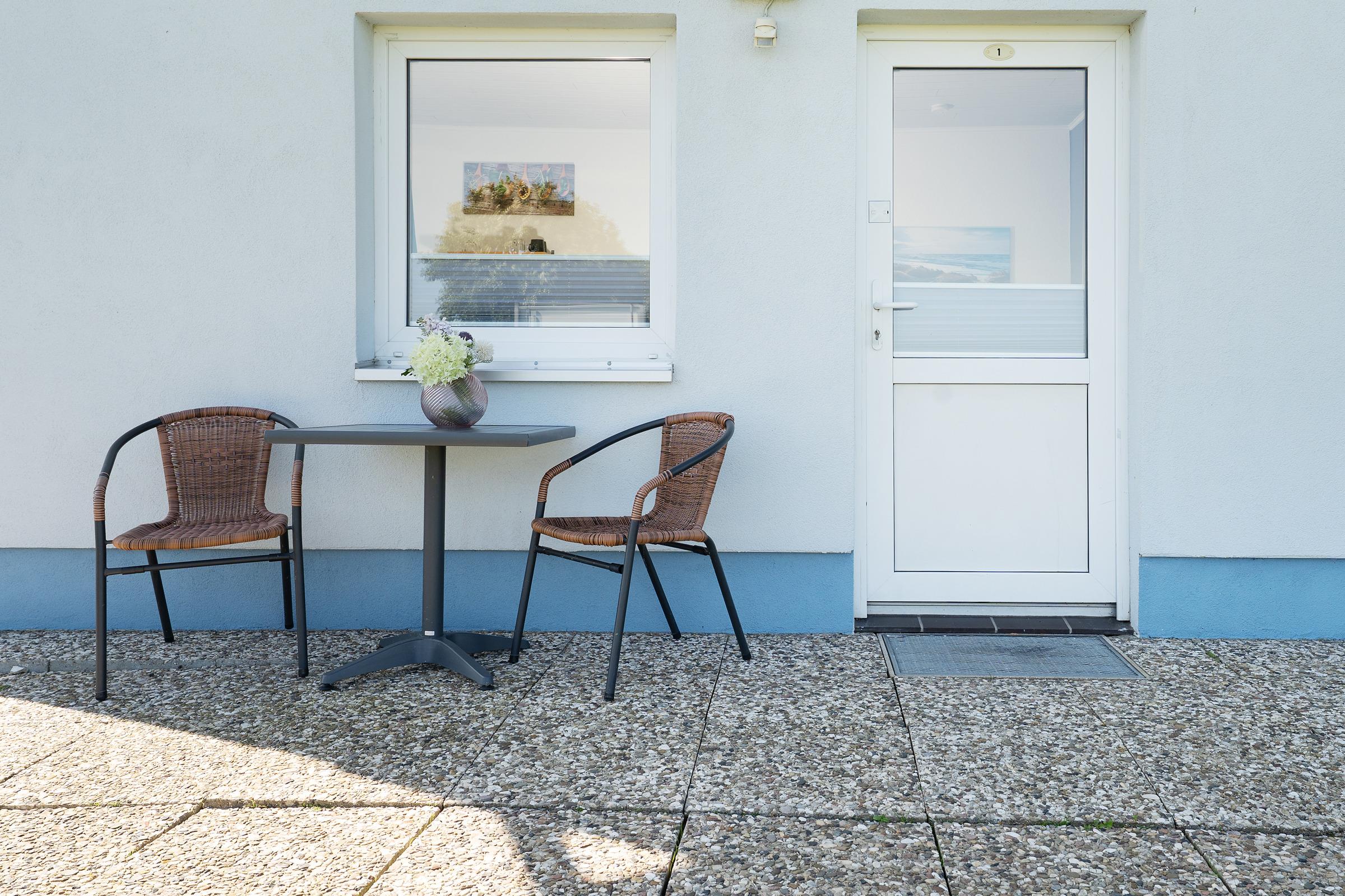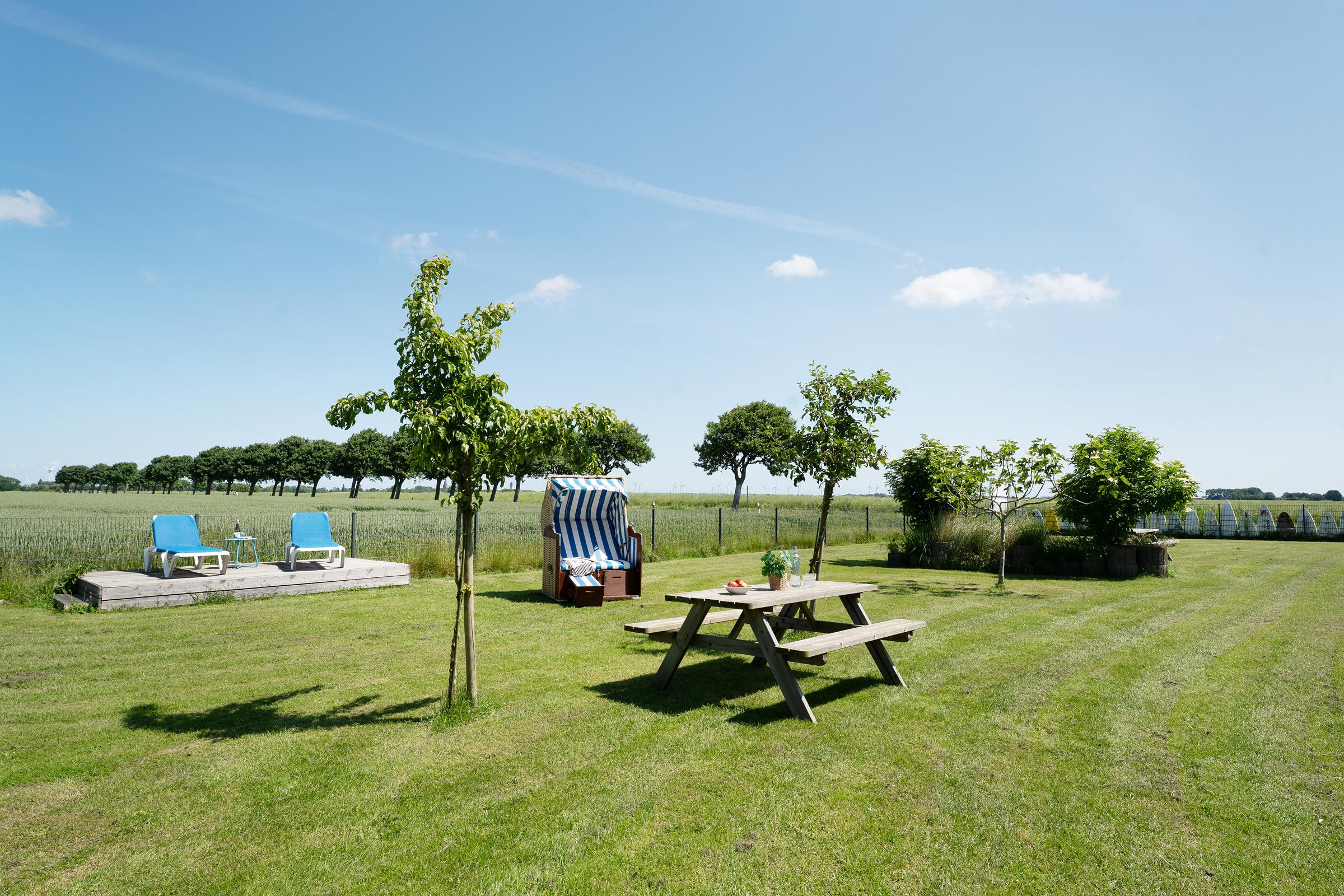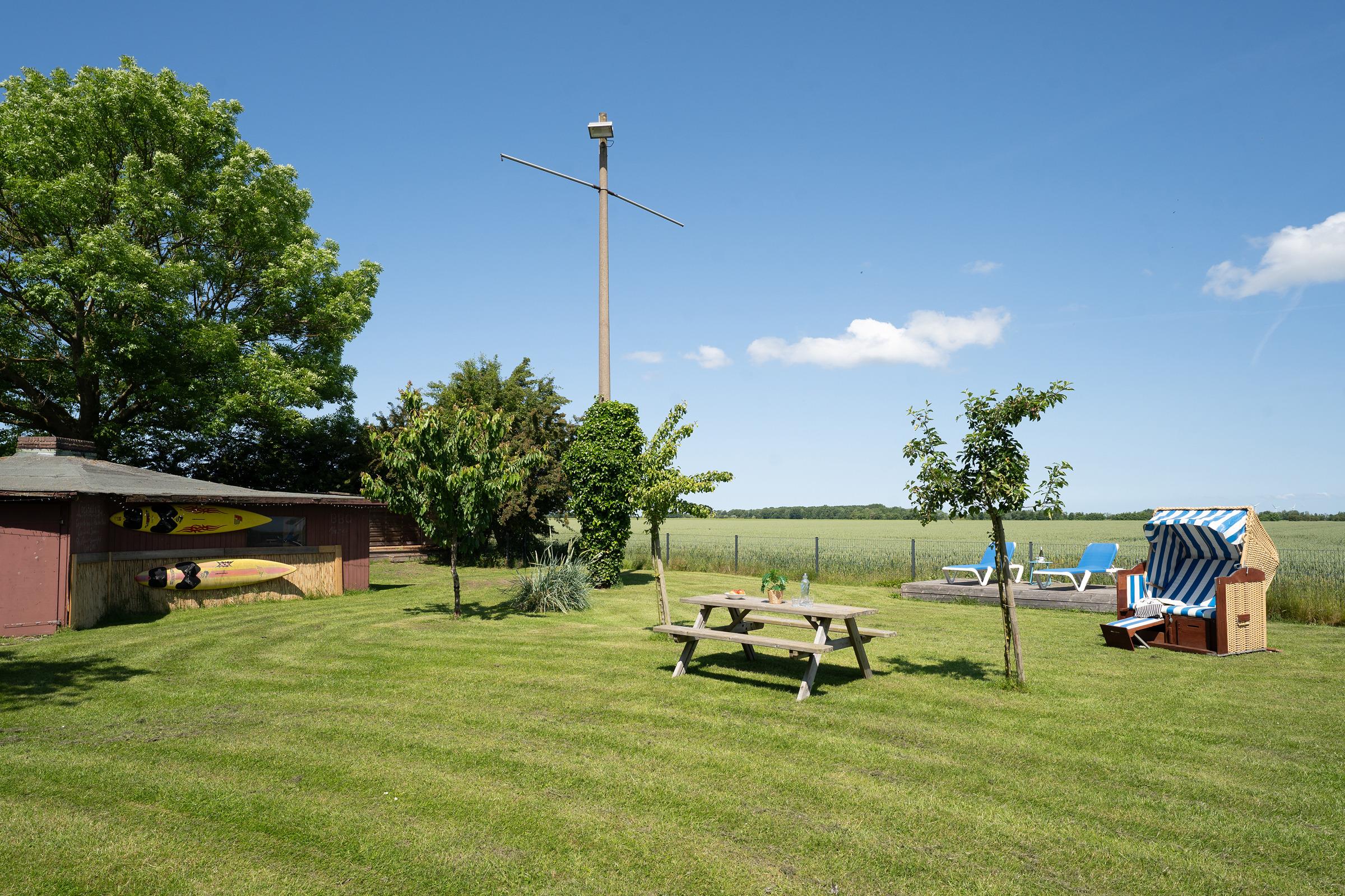 Gemütliche Ferienwohnung mit Gemeinschaftsgarten und Strandkorb in Fehmarn-Sulsdorf für erholsame Tage.
