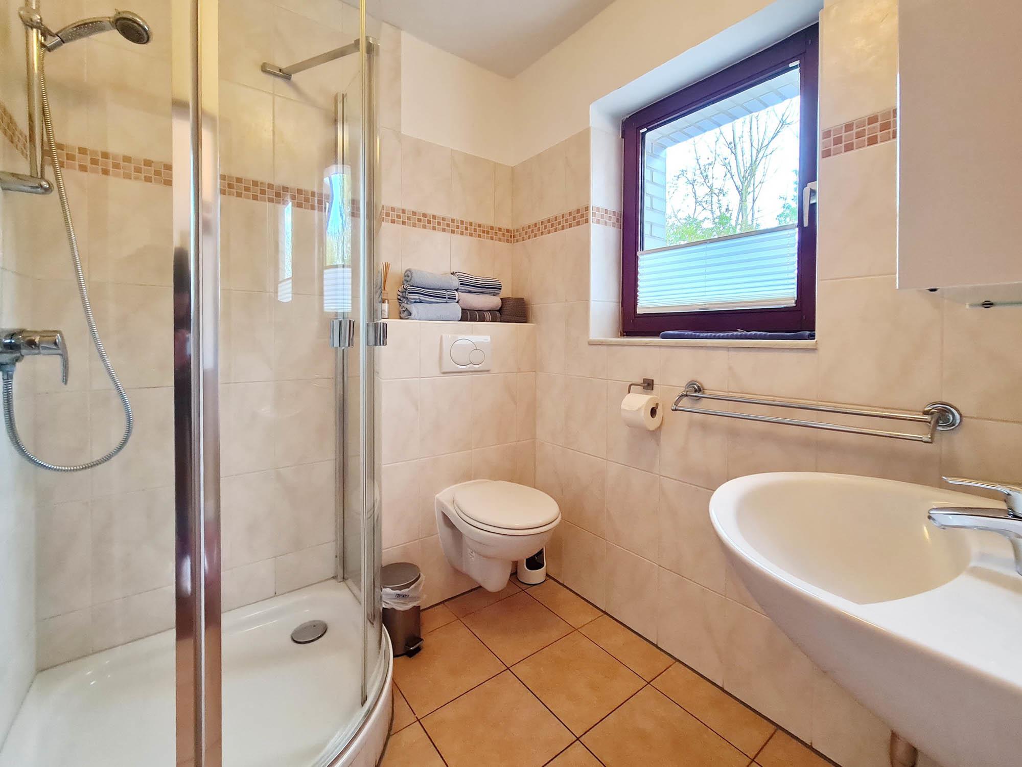 Das Badezimmer mit Waschtisch, WC und bodenbündiger Dusche mit Echtglasabtrennung bietet genügend Platz und Abstellfläche.