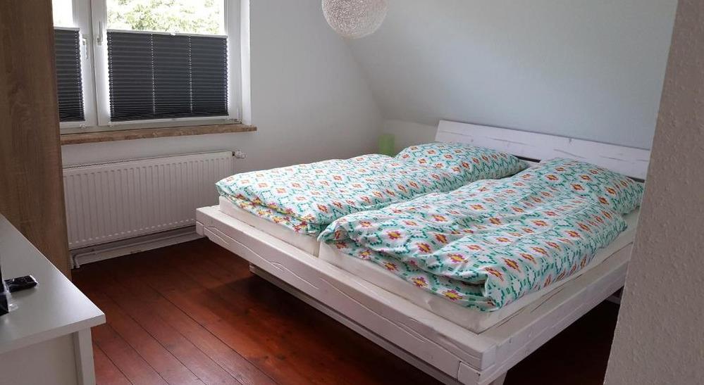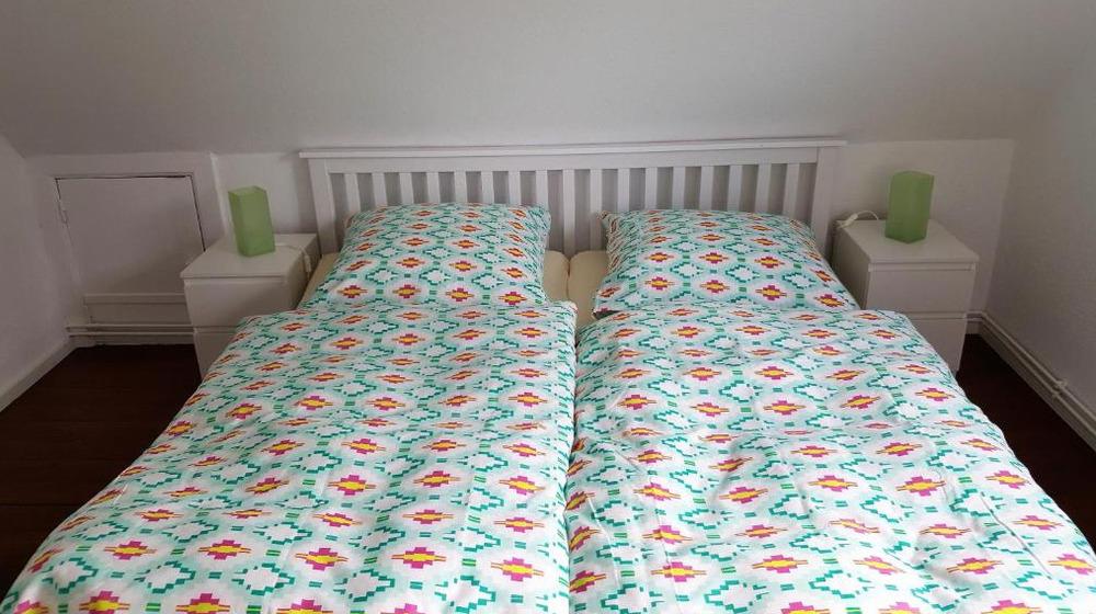 Über die Treppe kommen Sie dann in die zwei Schlafzimmer mit jeweils zwei Doppelbetten.
