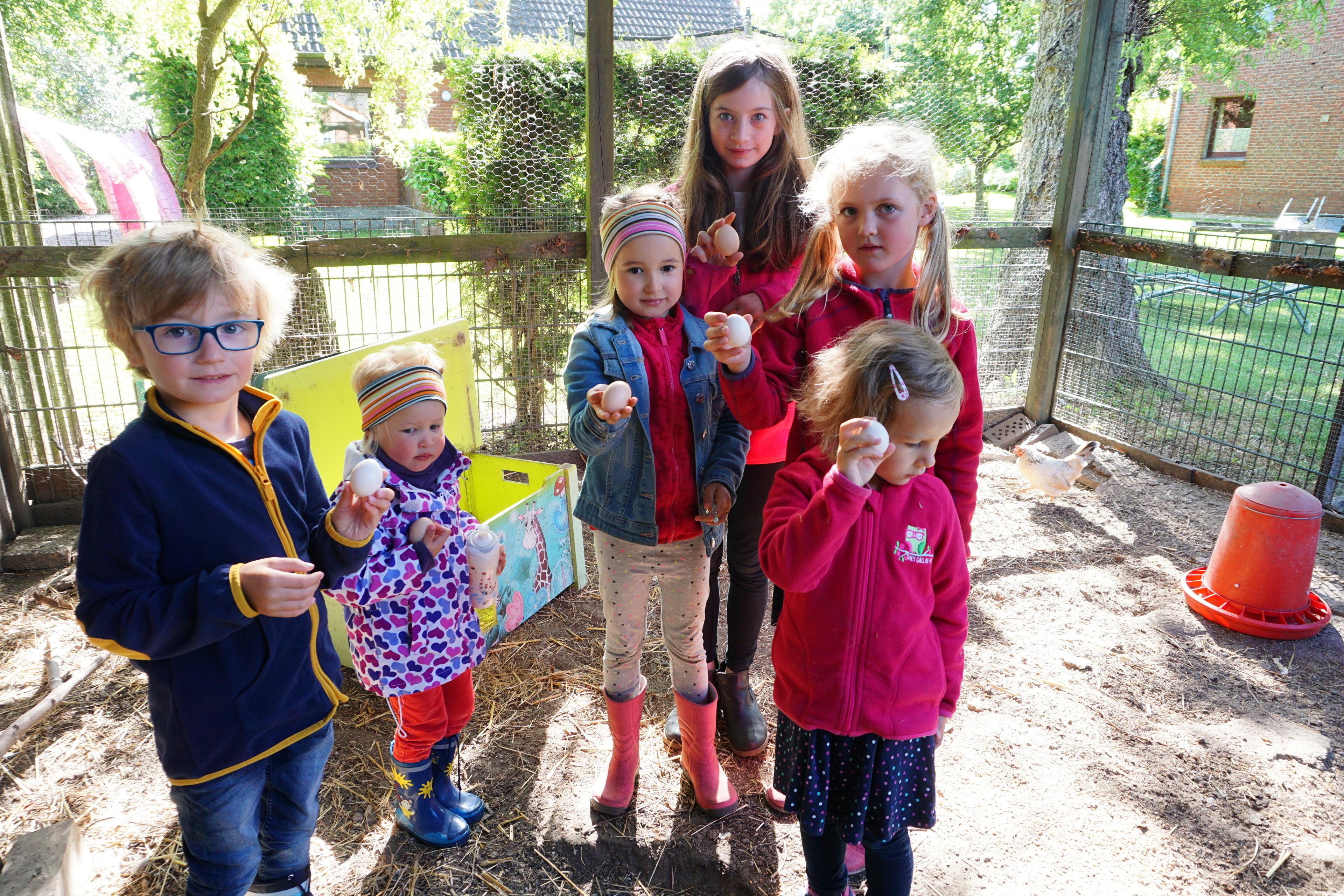 Auf dem Spielplatz mit Trampolin können die Kleinen sich richtig austoben, mit den Fahrzeugen (Dinocars) geht es auf Entdeckungstour und beim Ponyreiten und Tierefüttern von Minischafen, Kaninchen, Ziegen und Hühner werden neue Freundschaften geschlossen. In unserer Spielscheune beim Basketball, im Spielzimmer beim Kickerspielen oder in der Fahrzeughalle mit einer großen Auswahl an Kettcars, Bobbycars, Rollern etc vergeht die Zeit bei schlechtem Wetter wie im Fluge. Immer wieder ein Highlight für große und kleine Gäste die landwirtschaftliche Planwagenfahrt mit dem Bauern zur Rinderweide. Während der Tour schnacken und klönen die Großen mit dem Bauern und die Kleinen haben Ihren Spaß beim Landwirtschaftsquiz. Schließlich ist auf einen Bauernhof immer was los und es gibt ne Menge zu entdecken! Auch bei den gemeinsamen Grillabenden sind schon so manche Freundschaften entstanden.