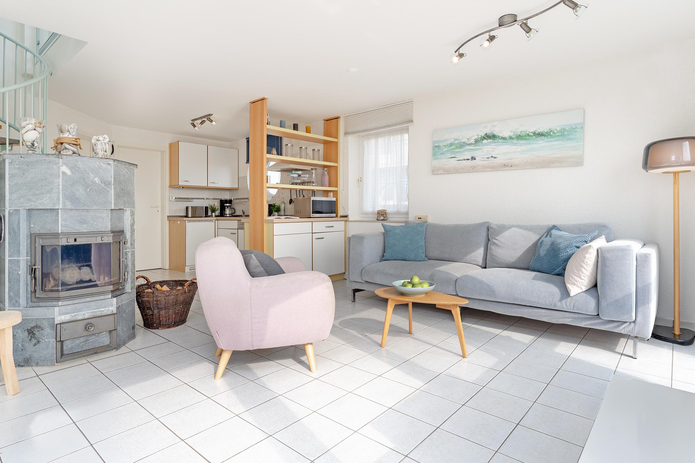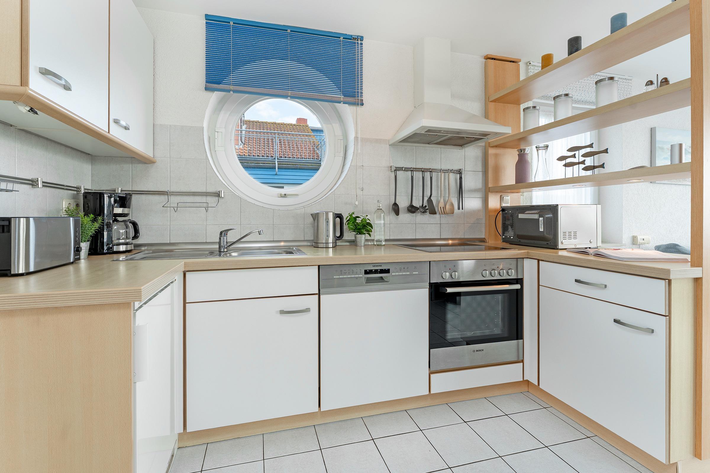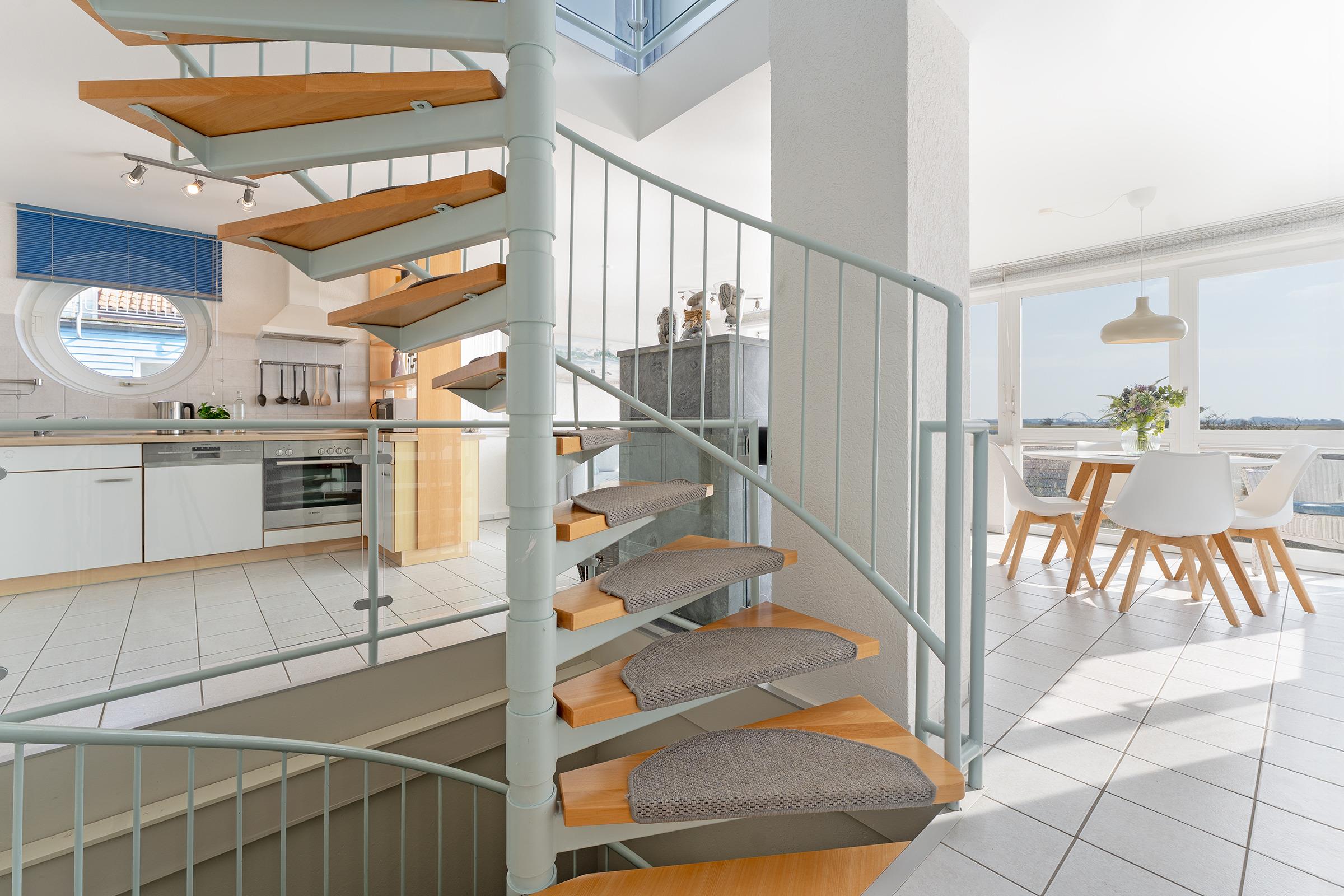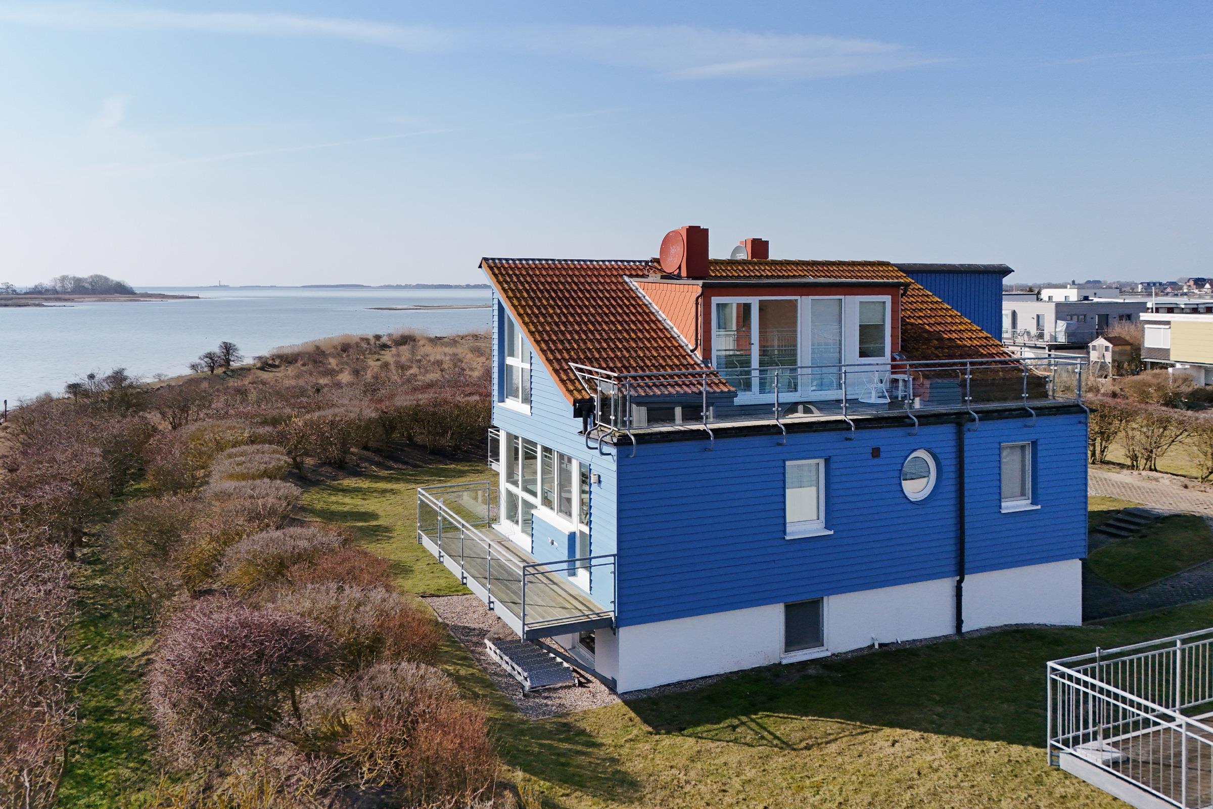 Herzlich Willkommen im blauen Haus. Herzlich Willkommen an einem besonderen Ort! Am Ende einer Sackgasse, direkt am Naturschutzgebiet mit einem fantastischen Blick auf das Meer, die Bucht und die Fehmarnsundbrücke. Zwei Balkone zum Sonnen, Essen und Genießen im Sommer. Ein knisterndes Kaminfeuer im Winter - ein Aufenthalt im Ferienhaus Meerkieker ist zu jeder Zeit ein Erlebnis. Der Eingangsbereich befindet sich im Tiefgeschoss, gleich neben dem PKW-Stellplatz und der Garage. Von dort geht es über eine Wendeltreppe nach oben in den hellen Wohn- und Essbereich mit offener Küche und Zugang zum Balkon. Hier erwarten Sie ein großes Sofa, Sat-TV, Kaminofen sowie ein bequemer Essplatz. Die Küche ist z. B. mit Geschirrspüler, Cerankochfeld, Backofen, Kaffeemaschine und vielem mehr ausgestattet. In diesem Geschoss befindet sich auch ein Schlafzimmer mit Doppelbett (180x200 cm) und ein Duschbad. Über eine weitere Wendeltreppe gelangen Sie zum zweiten Schlafbereich mit zwei Einzelbetten (je 80x200 cm) und einem Vollbad. Sowohl das Dachgeschoss als auch das Erdgeschoss haben einen Balkon mit Meerblick.