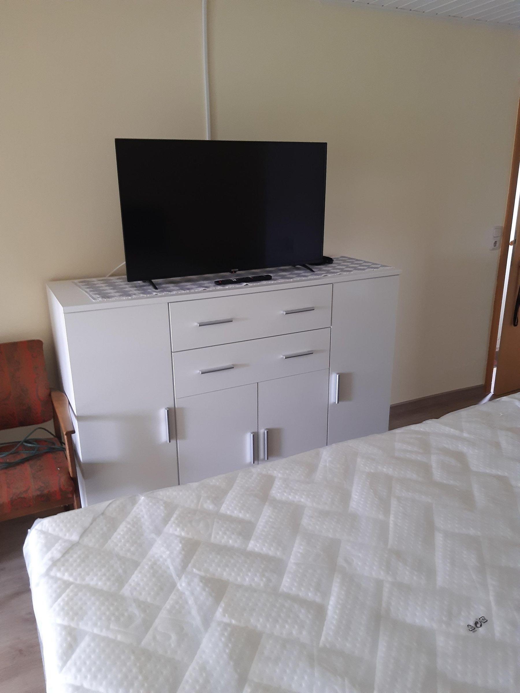 Schlafzimmer: Doppelbett, TV, Kommode.