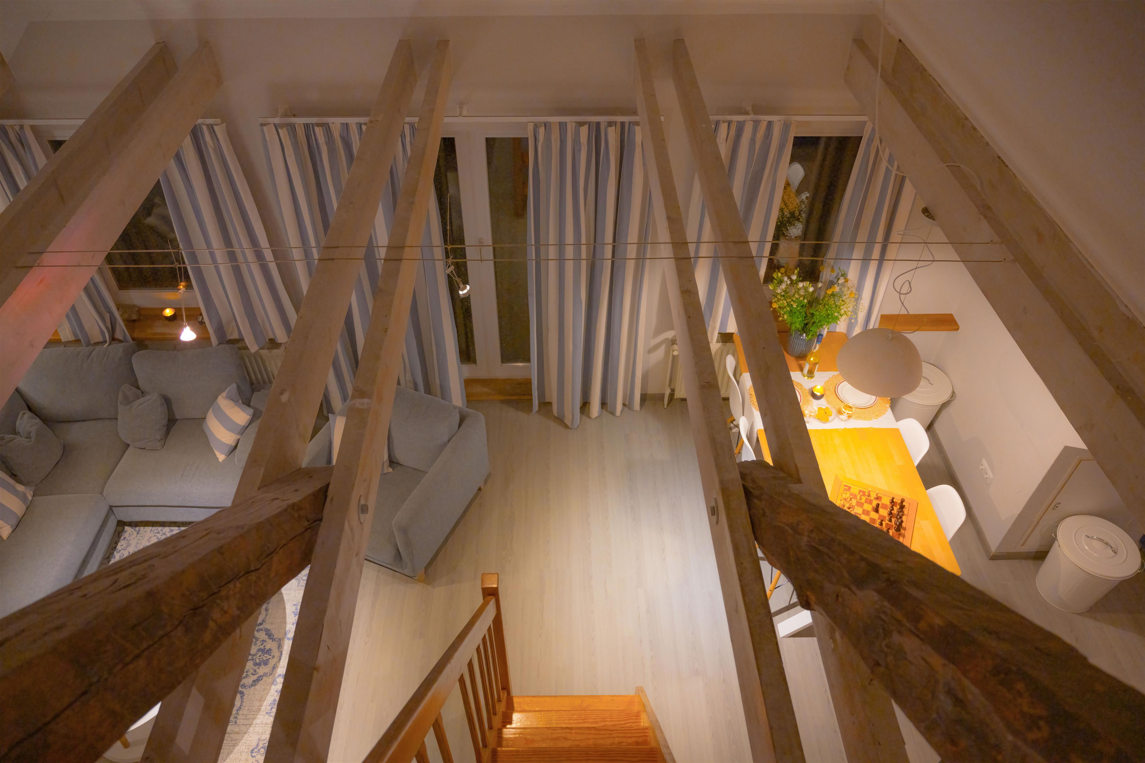 Diese komfortable Ferienwohnung - mit sonnigem Südbalkon und Blick auf die Apfelbäume und den Schafgarten - liegt in der ersten Etage des Bauernhauses auf einem 21ha großen Hof- und Gartengrundstück. Der Kaminofen im großzügigen Wohn-/Essraum mit Sofa garantiert gemütliche Abende. Freuen Sie sich über viel Platz für die ganze Familie: eine Küchenzeile (mit Spülmaschine und Mikrowelle), eine Schlafgalerie, zwei zusätzliche Schlafzimmer, ein Duschbad sowie ein separates WC.