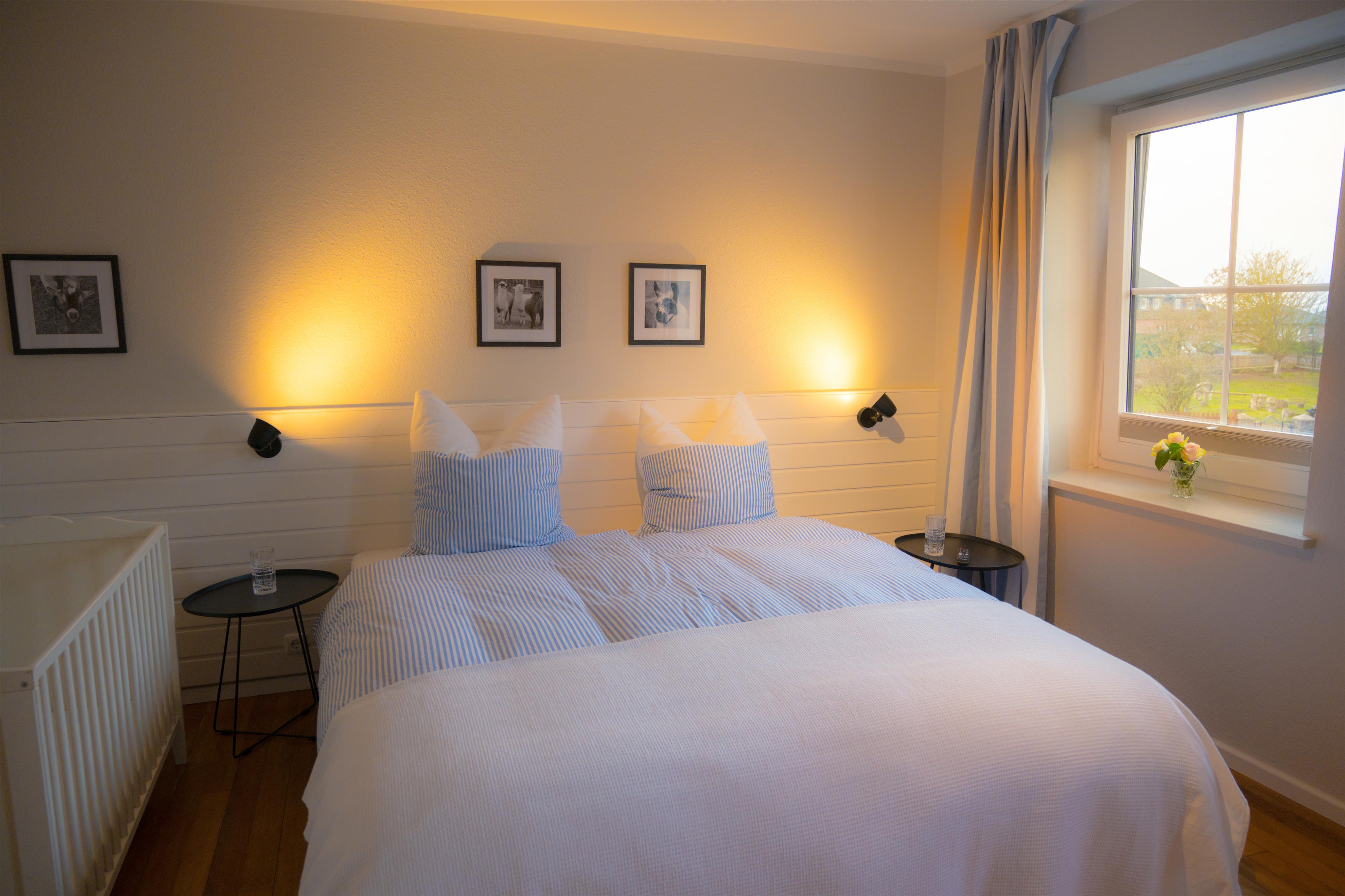 Willkommen im Scheuentrakt zur Dorfseite auf unserem 20ha großen Hof- und Gartengrundstück! Im Erdgeschoss Ihrer Ferienwohnung liegt der großzügige Wohn- Essraum mit Kaminofen und einer Küchenzeile sowie ein separates WC. Auf der gemütlichen Terrasse Richtung Westen können Sie das gute Wetter auf Fehmarn in vollen Zügen genießen. In der ersten Etage befindet sich eine Schlafgalerie, ein Schlafraum und ein Duschbad.