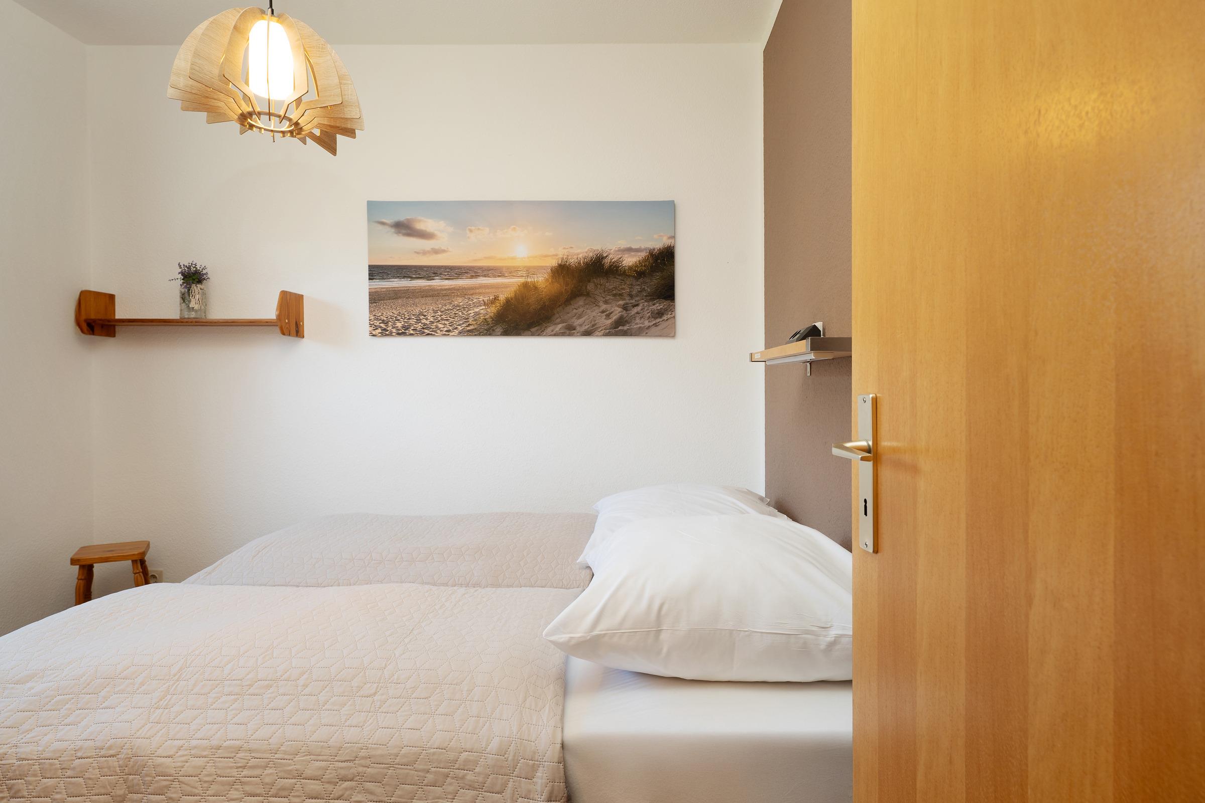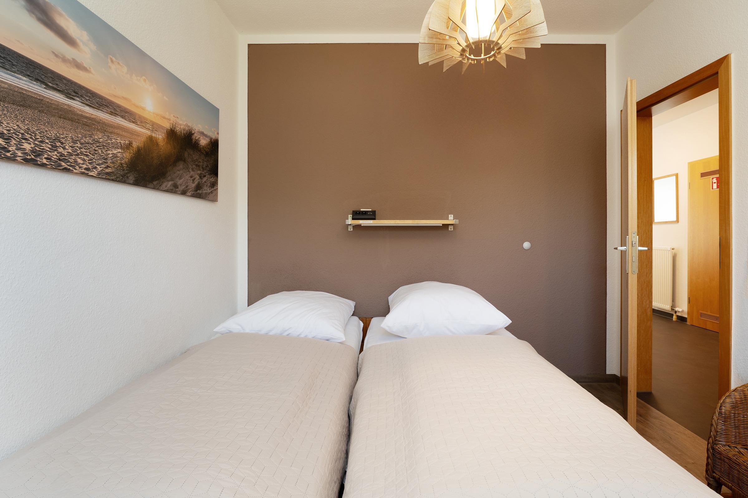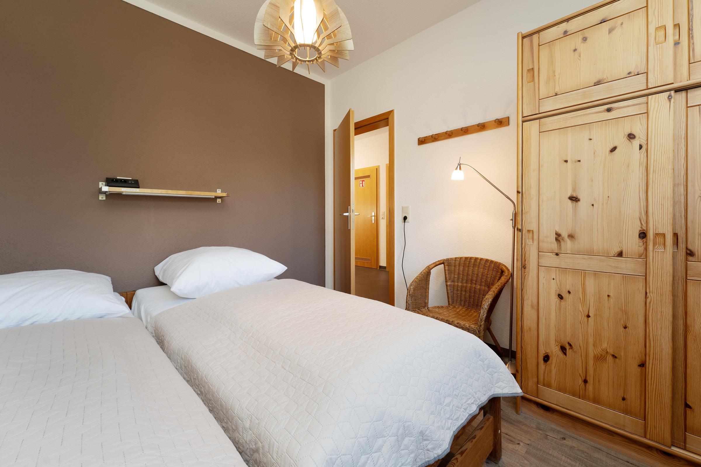 Schlafzimmer 2: 2 Einzelbetten (90 x 200 cm), Kleiderschrank, Verdunkelung (Plissee, Vorhang), kein Platz für Kinderreisebett vorhanden