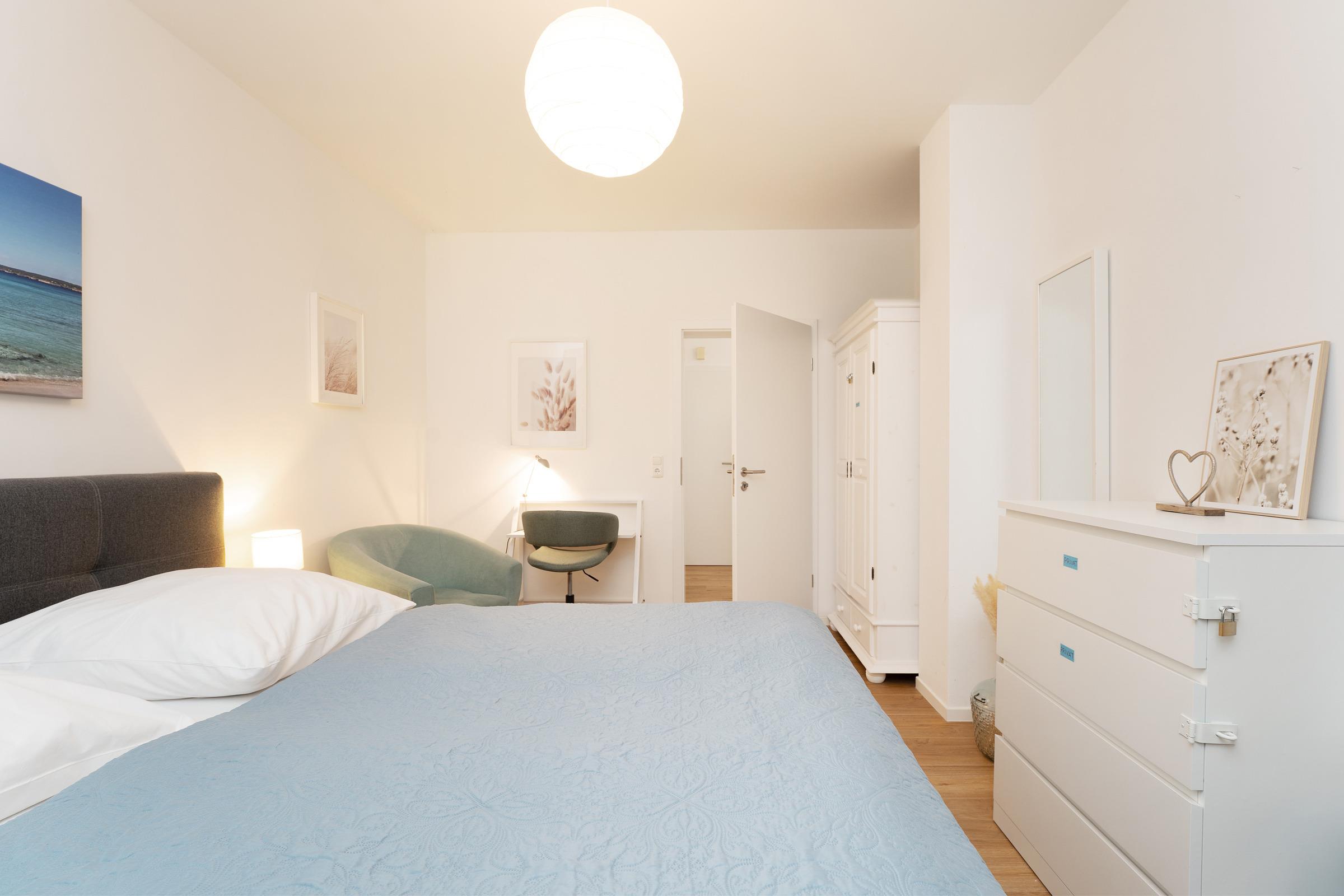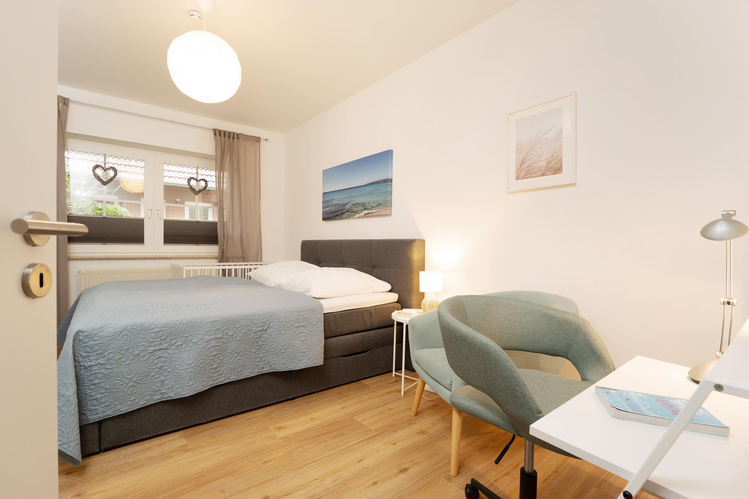 Schlafzimmer 1: 1 Doppelboxspringbett (180x200 cm), Kommode, Verdunkelung: Plissee