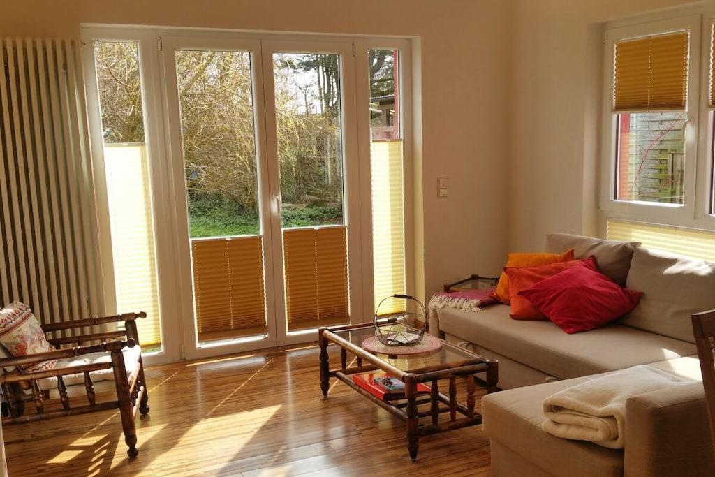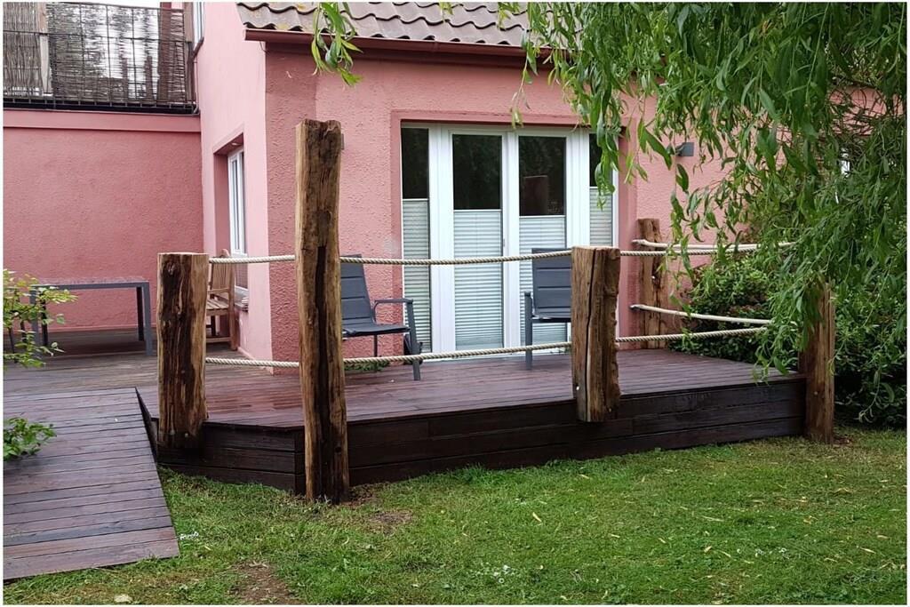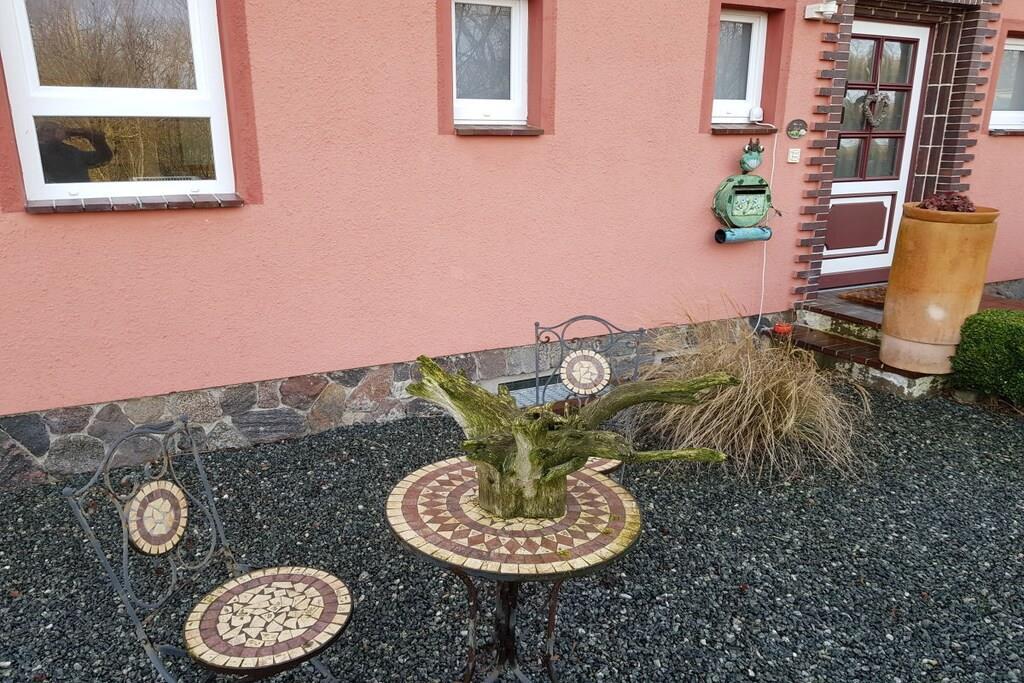 In ruhiger Lage direkt an einem wunderschönen Naturteich befindet sich im EG unsere Ferienwohung " Vogelflug". Sie ist durch exklusive Spanndecken und integrierter Beleuchtung sowohl modern als auch gemütlich und wohnlich ausgestattet. Das mediterran gestaltete Bad beinhaltet jeine ebenerdige behindertenfreundliche Dusche , WC und Waschtisch. Ein (1) separates Schlafzimmer mit Doppelbett, sowie die Bettcouch im Wohn/Esszimmer garantieren einen erholsamen Schlaf. Die abgetrennte Kochküche ist komplett eingerichtet. Der Garten mit Grillplatz und die Terrasse mit großer Gartenlounge laden zum Sonnen, Grillen und Spielen ein, bei schlechterem Wetter bietet das Wohnzimmer einen gemütlichen Rückzugsort zum Entspannen.