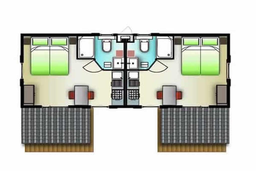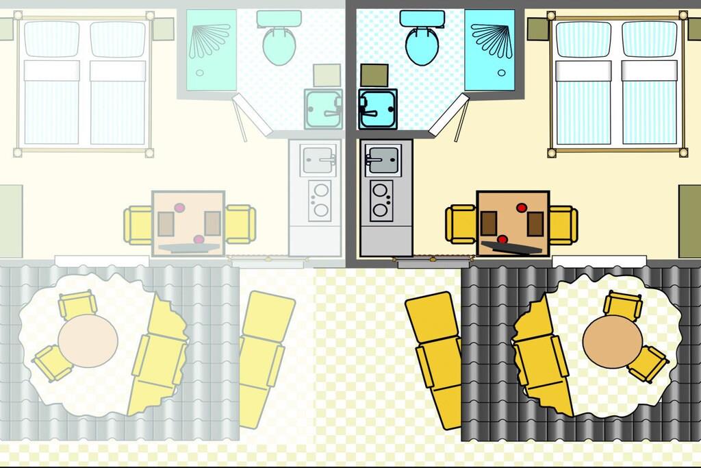 Das 19 m² große Chatel verfügt über 1 Wohn/Schlafzimmer mit einem Doppelbett 180 cm x 200 cm, Tisch mit 2 Stühlen, Sat-Farb-TV, Küchenzeile mit Kühlschrank, Duschbad, überdachte Terrasse mit Gartenmöbeln Das Chatel verfügt über eine Zentralheizung und wird mit Bettwäsche, Hand- und Geschirrhandtüchern und täglichem Hotel-Service angeboten.