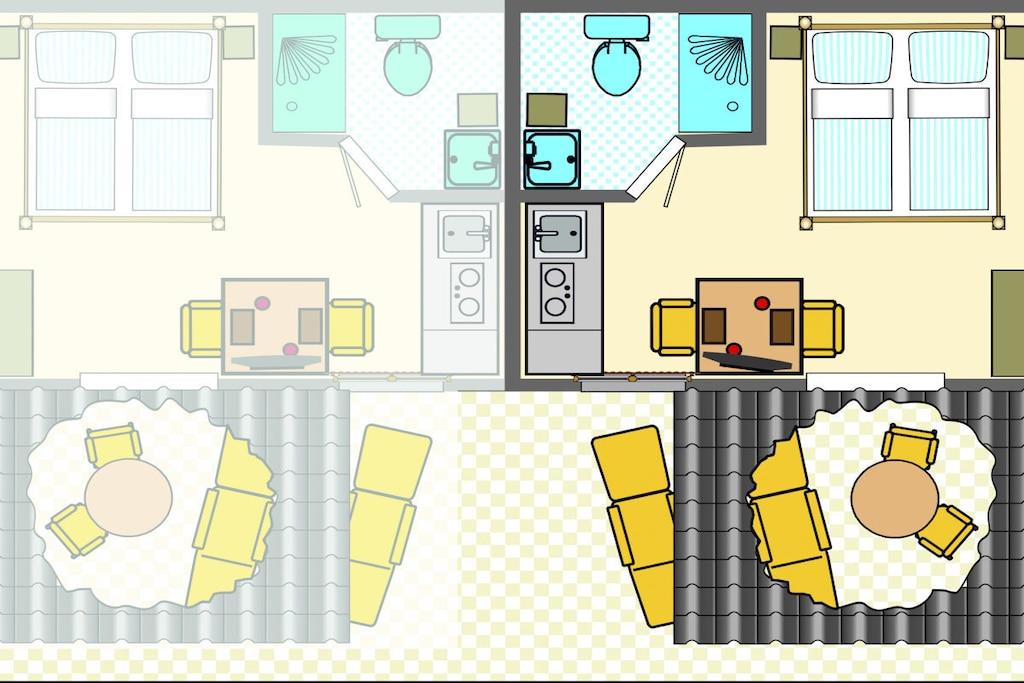 Parterre: (Küche(Mikrowelle), Wohn-/Schlafzimmer(Doppelbett, TV), Badezimmer(, Toilette, Dusche, Waschbecken)) , , , Heizung, Terrasse(Gartenmöbel, Markise), Wäschepaket gegen Gebühr, parken (kostenpflichtig)