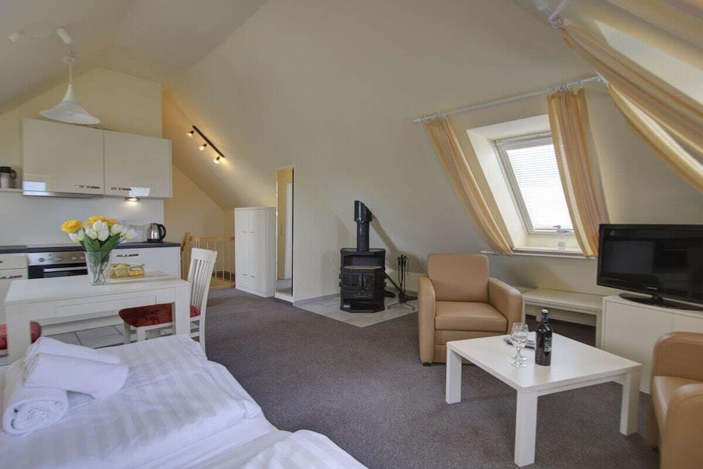 Gemütliche, kleine Ferienwohnung im Dachgeschoss mit herrlichen Dachschrägen - direkt am Golfplatz! Die Ferienwohnung ist mit einem Doppelbett, Sitz- und Essgruppe ausgestattet. Weiterhin bietet sie eine Küchenzeile und ein Badezimmer mit Dusche. Ein Parkplatz befindet sich vor dem Haus. Der Garten kann inklusive Gartenmöbeln mitgenutzt werden. Mindestmietzeit 7 Nächte