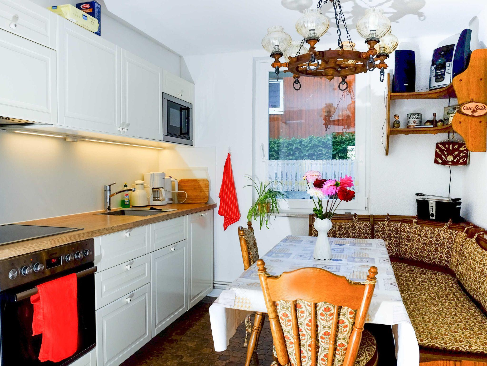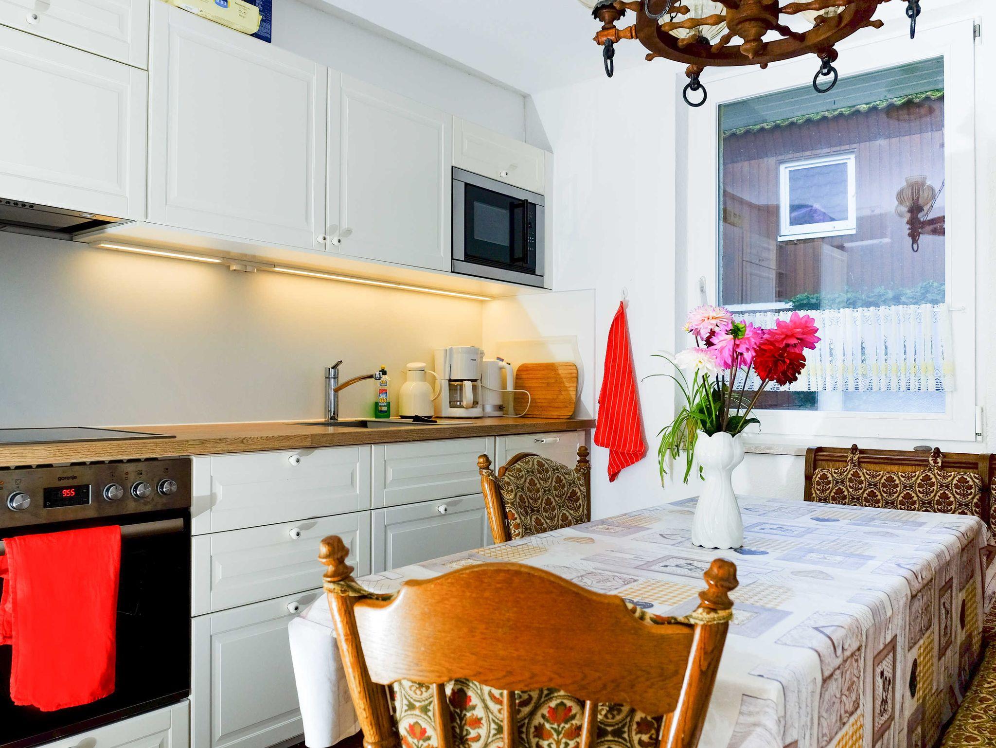 Vollausgestattete Küche mit Sitzecke. In der Küche ist vollständig mit Küchenutensilien bestückt.