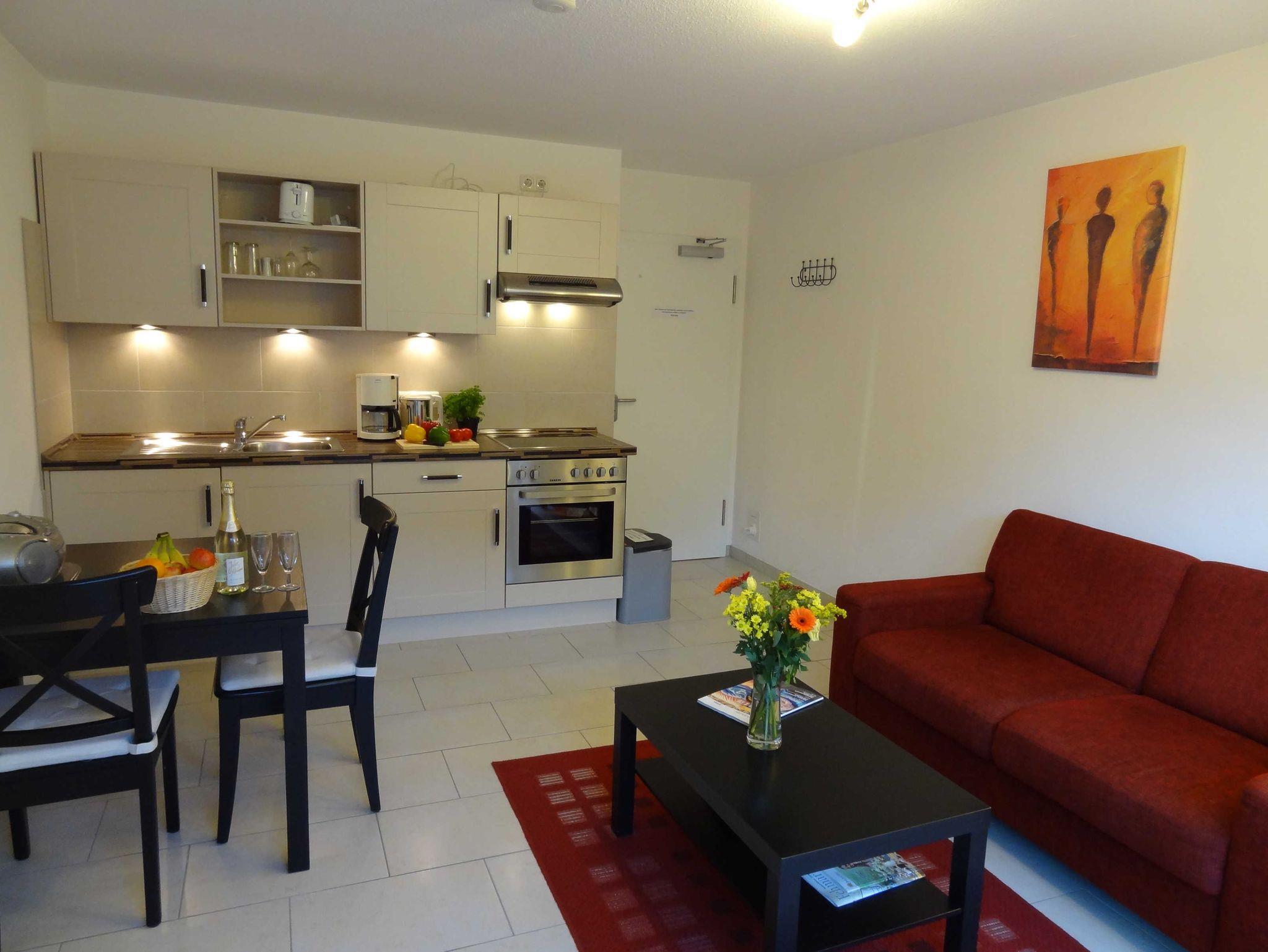 Die Ferienwohnung im Erdgeschoss ist mit ca. 35 qm für 2 Personen ausgelegt und verfügt über einen Wohnraum mit Küchenzeile, ein Bad mit Dusche und ein Schlafzimmer. Weitere Ausstattungsmerkmale: Sat-TV, Telefon kostenlos ( deutsches Festnetz außer Sondernummern ), PC-Anschluss DSL kostenlos, PKW-Stellplatz, Fahrradstellplatz, Waschmaschinennutzung, eigene Terrasse Südseite.