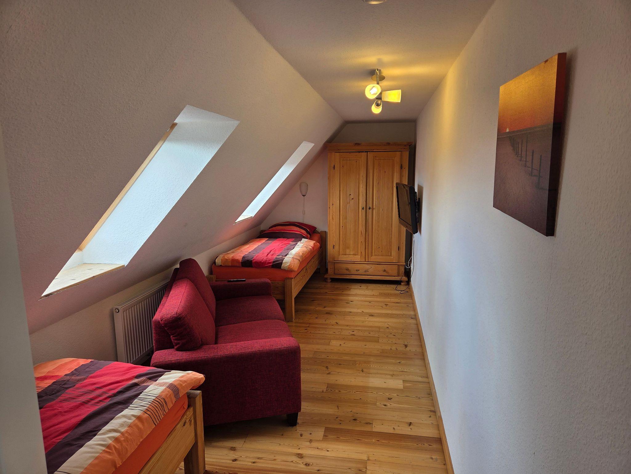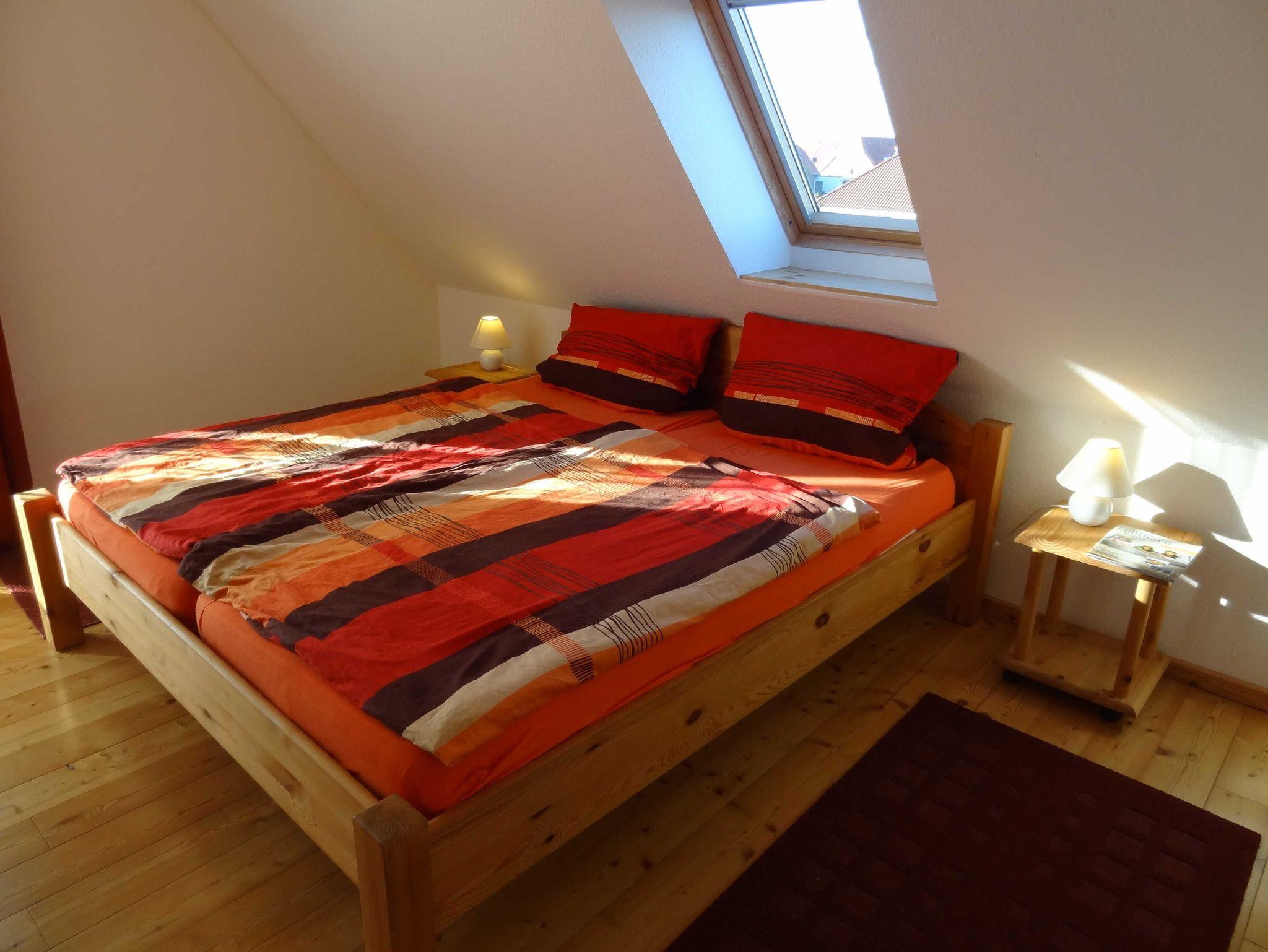 Die Ferienwohnung im Obergeschoss ist mit ca. 95 qm für bis zu 4 Personen ausgelegt und verfügt über einen Wohnraum mit einer integrierten U-Küche incl. Spülmaschine, ein Bad mit Dusche und zwei Schlafzimmer. Der große Balkon ist zum Westen ausgerichtet. Sie können von mittags bis abends die Sonne genießen. Weitere Ausstattungsmerkmale: 2x Sat-TV, Telefon kostenlos ( deutsches Festnetz außer Sondernummern ), PC-Anschluss DSL kostenlos, PKW-Stellplatz, Fahrradstellplatz, Waschmaschinennutzung.