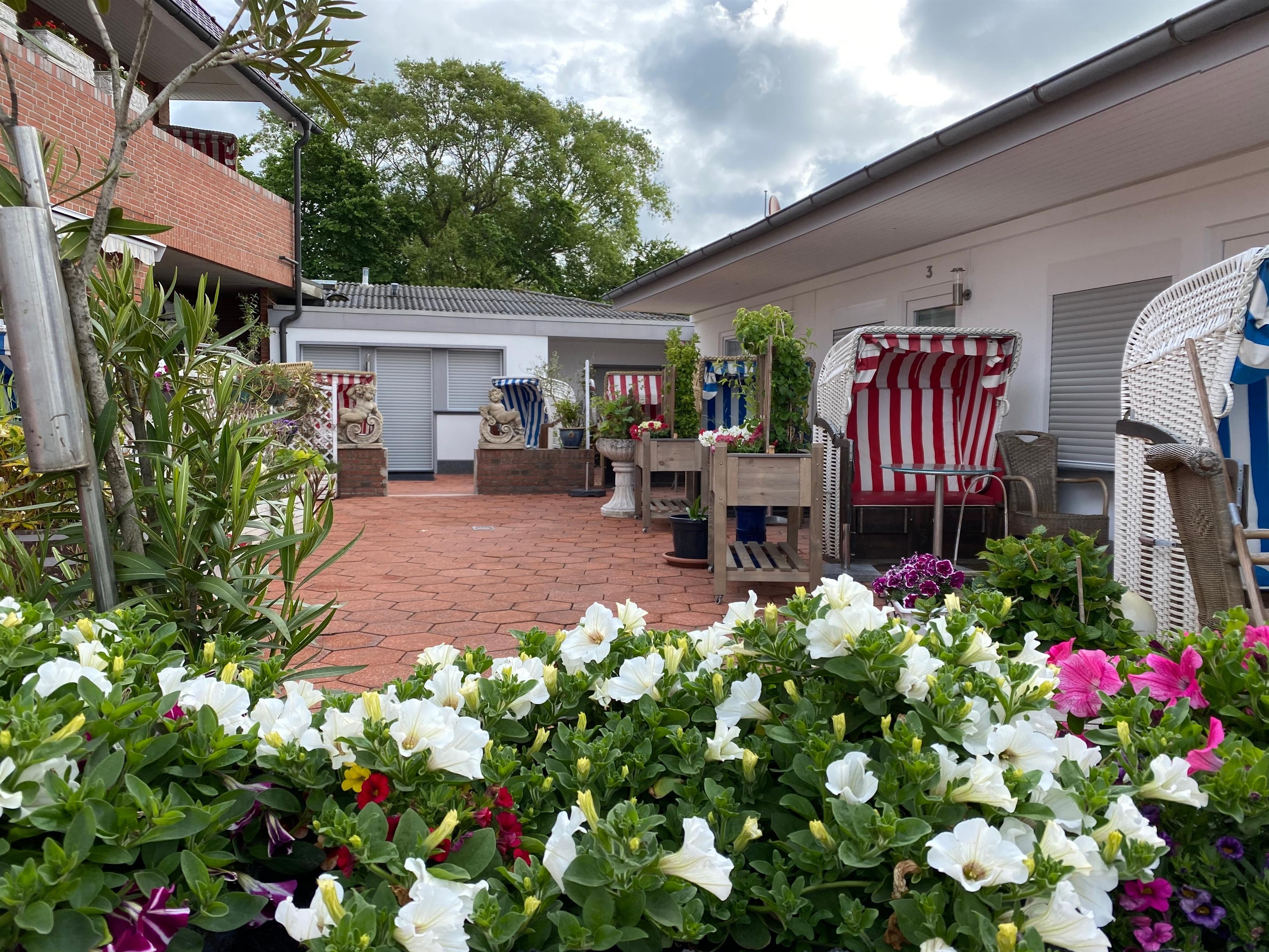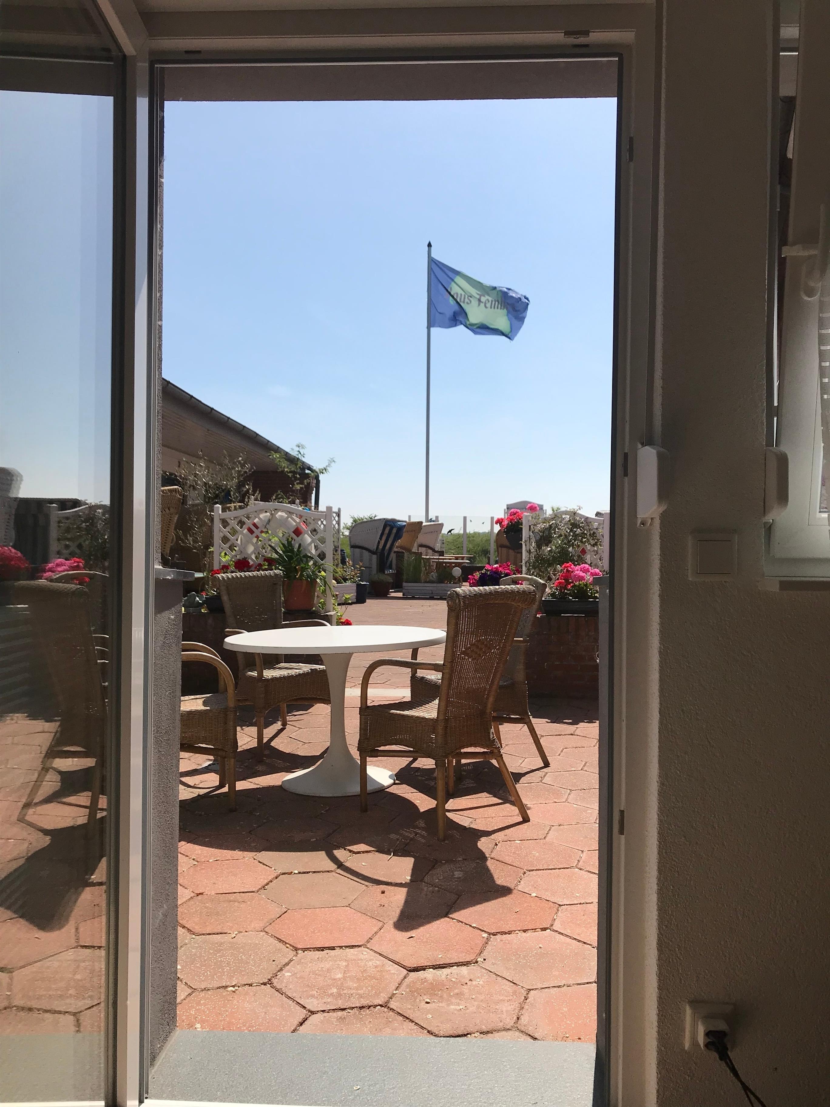 Im Anschluss an Euren Spaziergang könnt Ihr die letzten Sonnenstunden auf der Terrasse im Original-Ostsee-Strandkorb genießen.