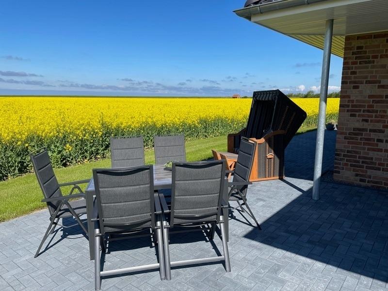 Das Highlight des Hauses ist der kombinierte Wohn- und Essraum mit Küche und Kochinsel. Dieser ist lichtdurchflutet und von diesem gelangt man auf die Süd-/Westterrasse. Auf dieser stehen ein Strandkorb, ein Sonnenschirm, ein Tisch mit ausreichend Sitzgelegenheiten und ein Grill.