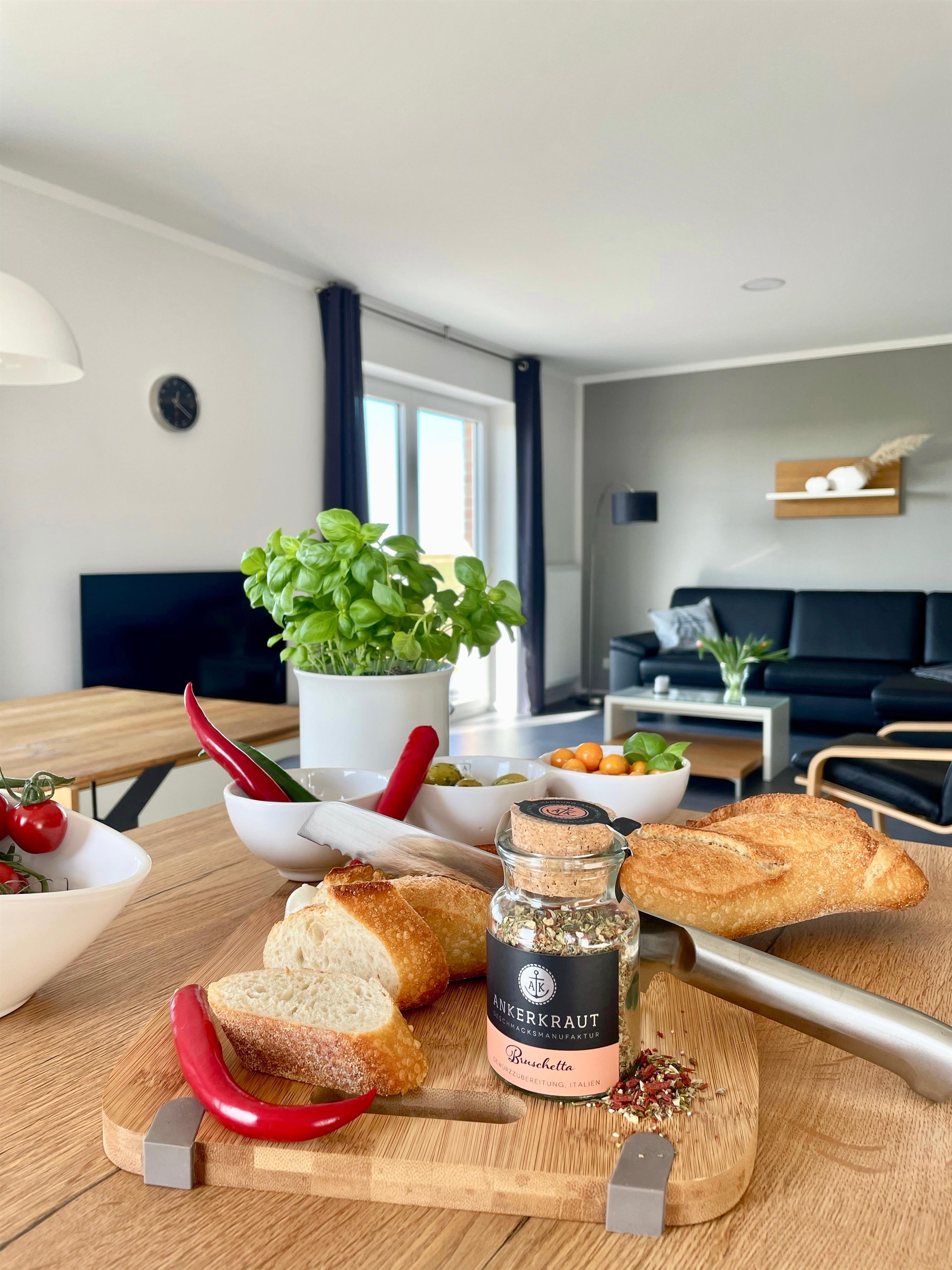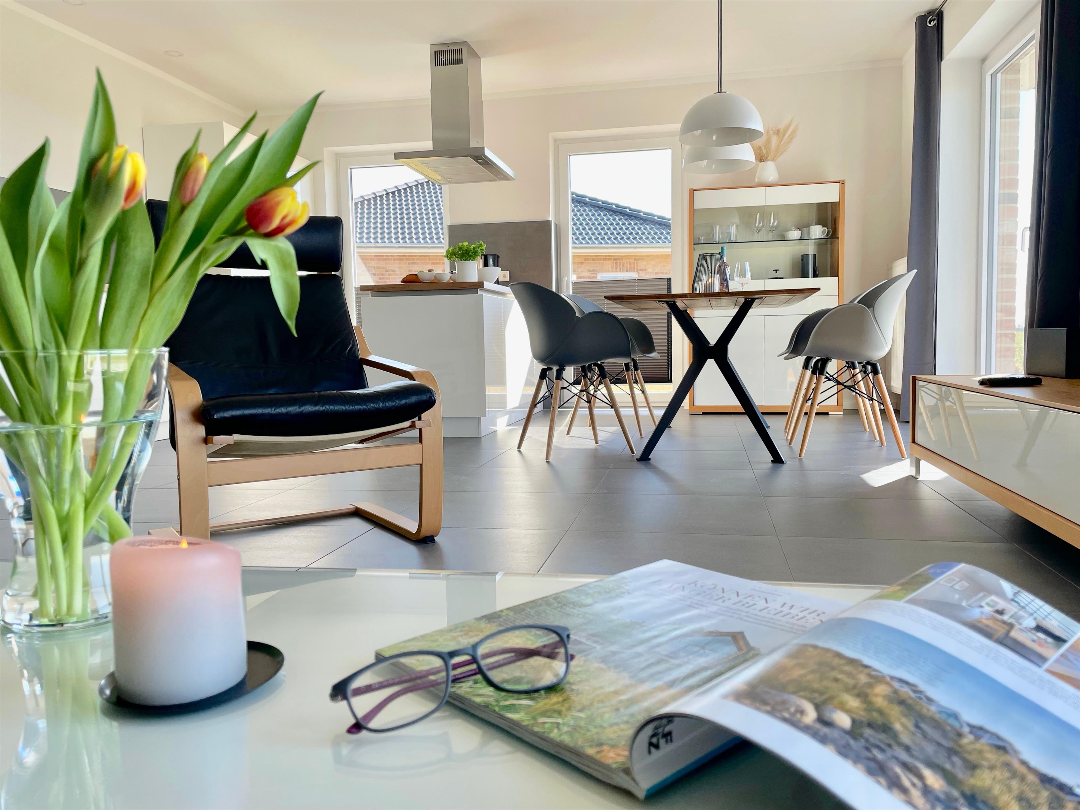 Modernes Ferienhaus Westwind auf Fehmarn, nur 500 m vom Strand entfernt, mit großem Wohnbereich und Terrasse.