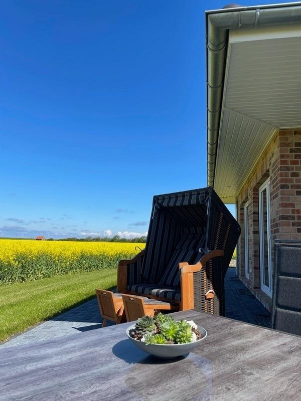 Bei dem Ferienhaus Westwind handelt es sich um einen 100 m/2 großen ebenerdigen Bungalow. Dieser verfügt über zwei Schlafzimmer mit Doppelbetten und über zwei Duschbäder mit begehbarer Dusche. Das Highlight des Hauses ist der große Wohn- Essbereich mit Küche und Kochinsel. Von diesem gelangt man auf die Süd-/Westterrasse mit Blick auf die Felder.