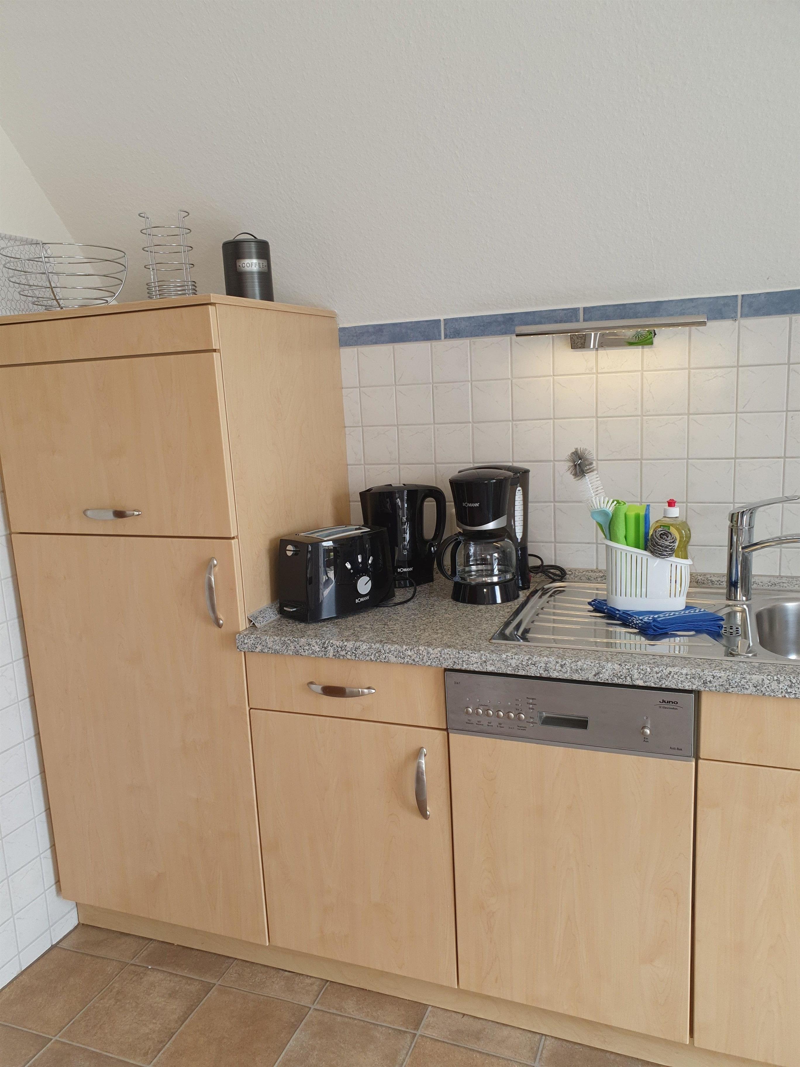 Die Küchenzeile ist voll ausgestattet incl. Ceranfeld, Geschirrspüler, Backofen, Mikrowelle , Toaster, Mixer, Eierkocher, Wasserkocher, Kaffeemaschine, Kühlschrank mit Eisfach.