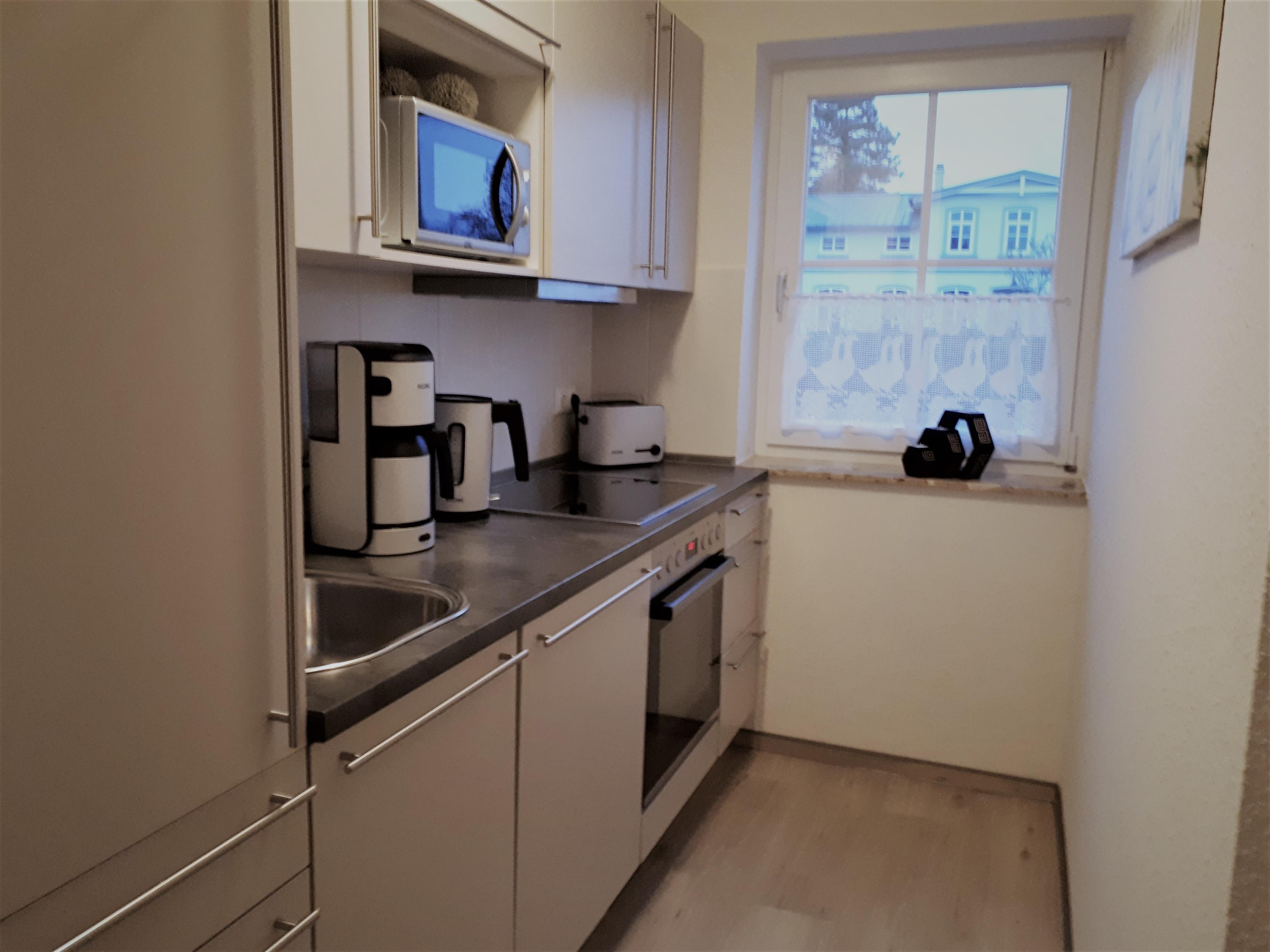 Die Küche ist komplett mit Geschirr, Backofen, Mikrowelle, Geschirrspüler, Kaffeemaschine, Mixer, Wasser- und Eierkocher ausgestattet.