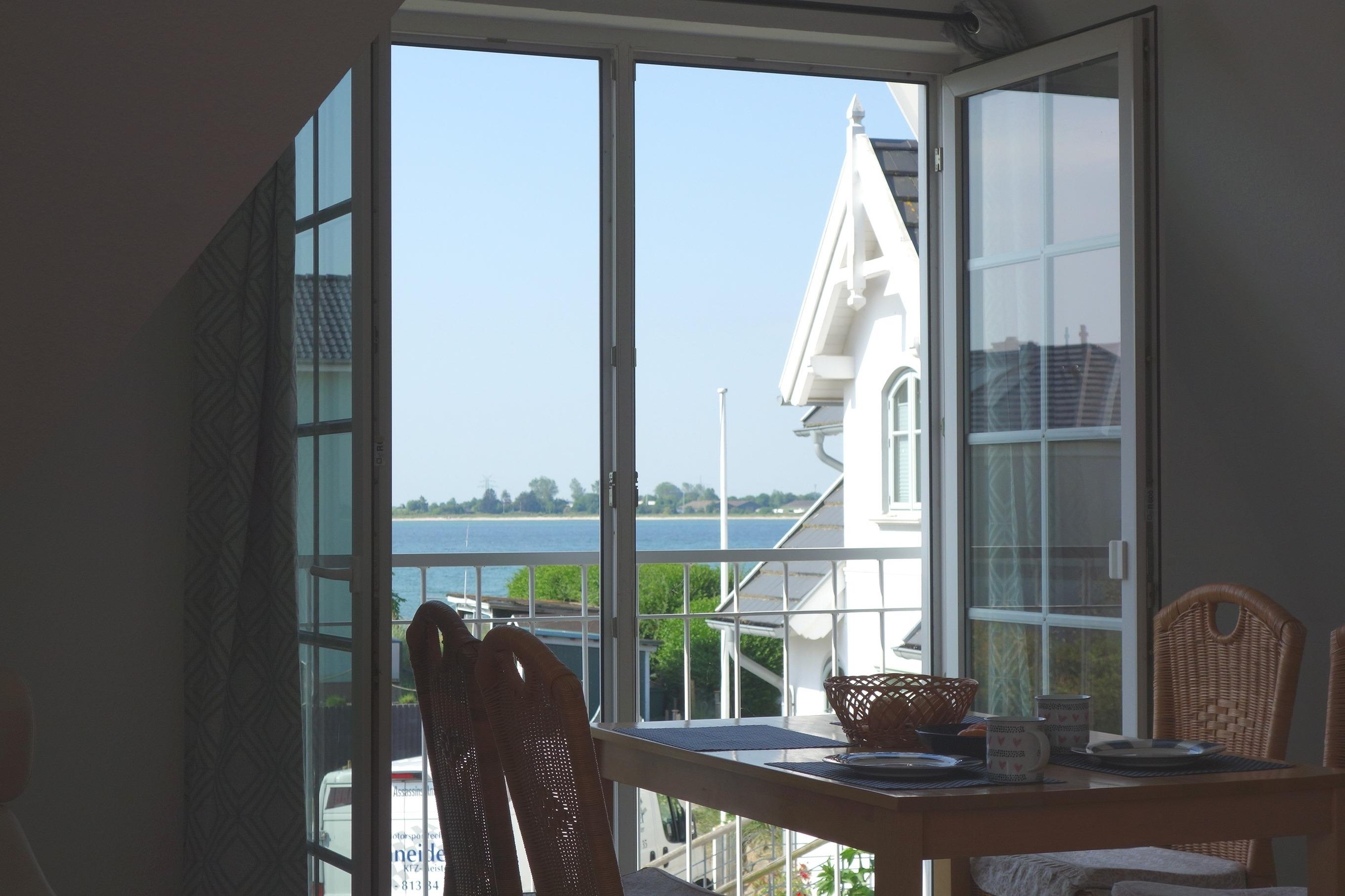 Helle 100 m² Ferienwohnung auf Fehmarn mit Meerblick, Balkon, Kamin und Strandnähe für entspannte Urlaubstage.