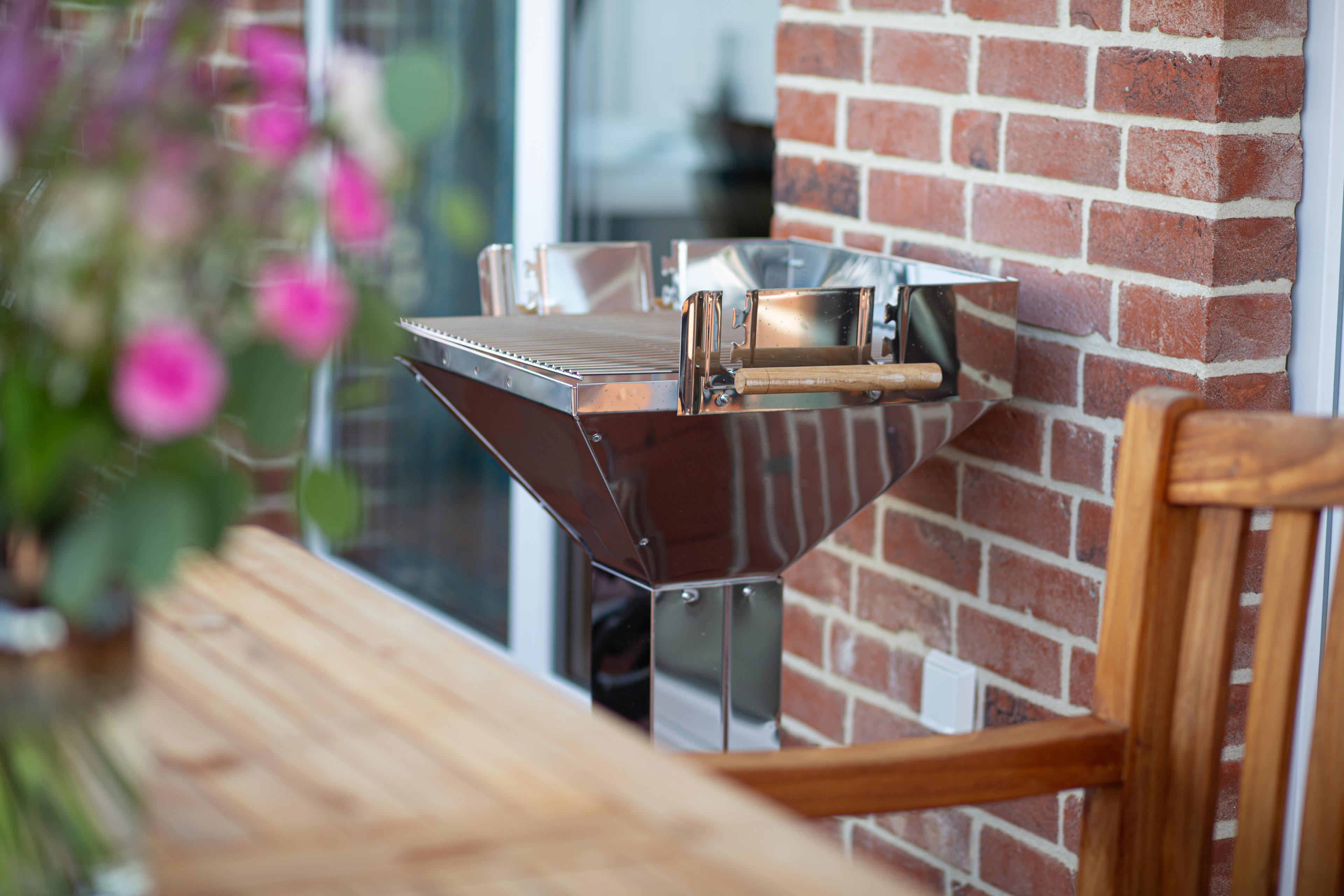 Die großen Panoramafenster geben den Blick frei auf die eigene Sonnenterrasse mit Gartenmöbeln, Strandkorb und Grillstation.