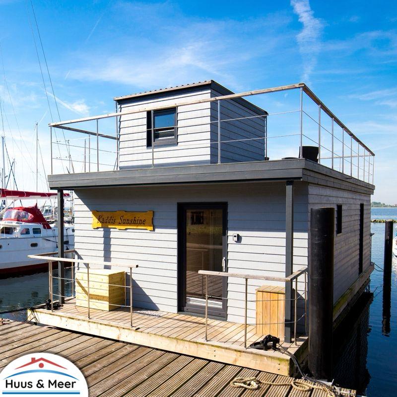 Hausboot Kaddis Sunshine auf Fehmarn mit Meerblick, großem Sonnendeck und eigenem Strandkorb für entspannte Urlaubstage.