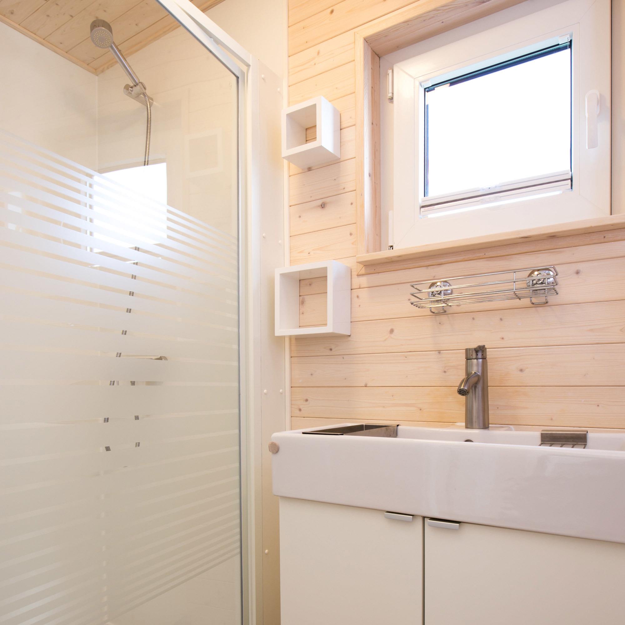 Das Dusch-Bad ist ausgestattet mit Dusche, Waschbecken, Spiegel und Föhn, nur hier befindet sich die Fußbodenheizung. Das Hauboot verfügt über einen 40Liter Warmwasserboiler (warmes Wasser ist daher nur begrenzt nach Verbrauch verfügbar).